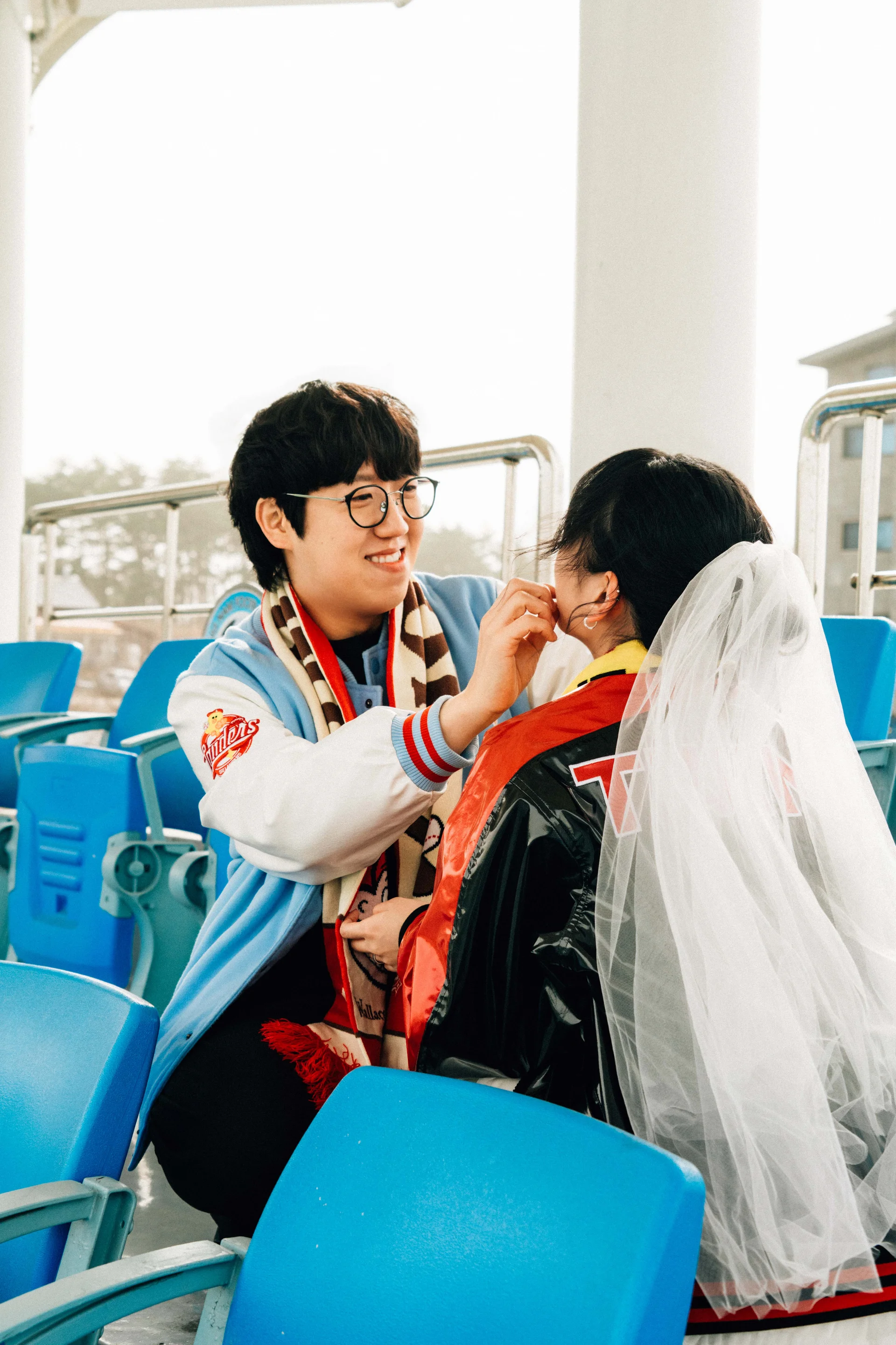 색감의 조화: 관중석의 비비드한 컬러와 유니폼의 색감이 어우러져, 일반적인 화이트 톤의 웨딩스냅과는 차별화된 개성 넘치는 결과물이 탄생했습니다.