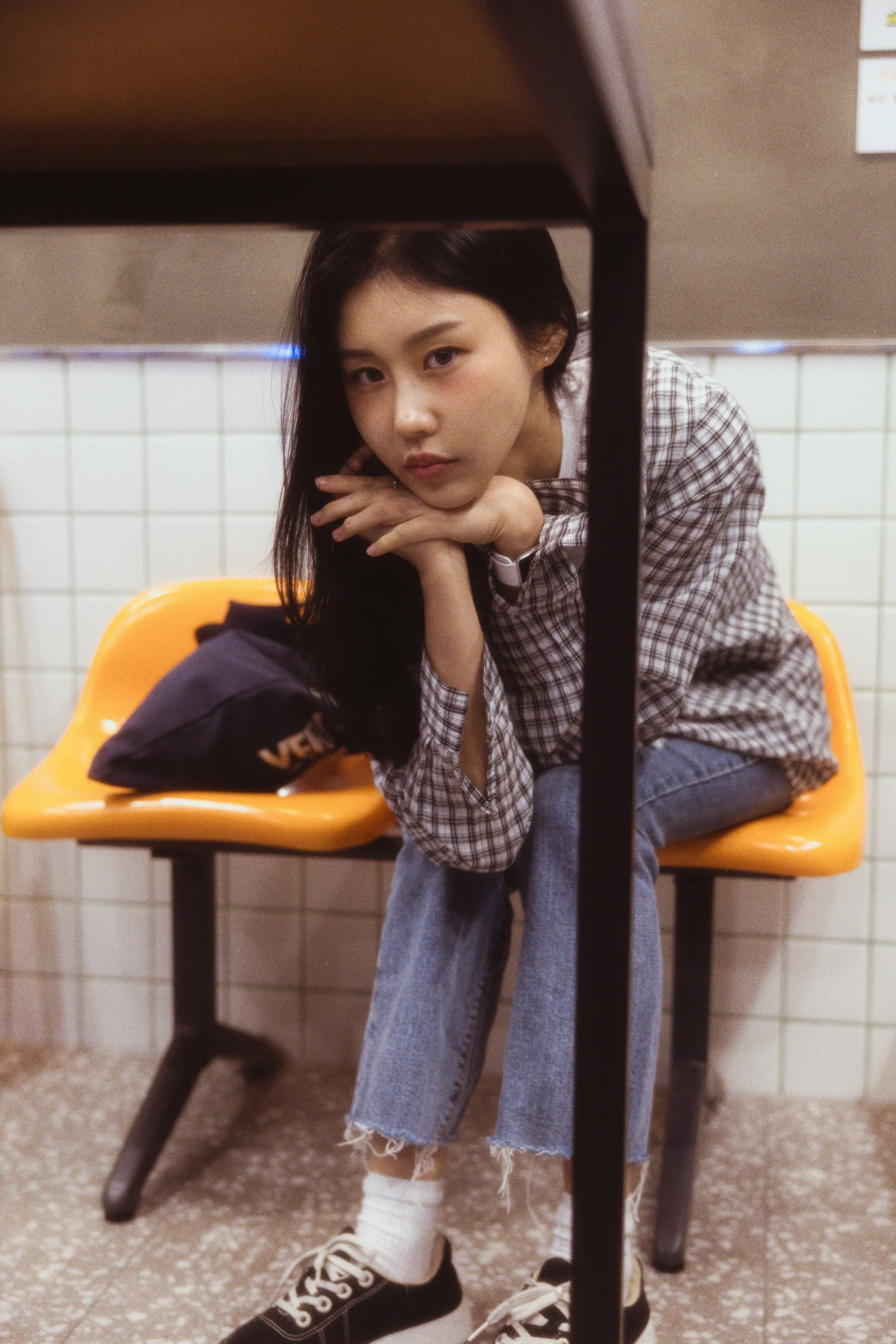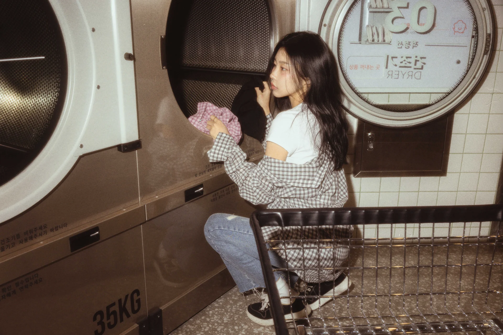 코인세탁소는 누구나 가는 곳이지만, 작가의 시선이 더해지면 훌륭한 화보 촬영지가 됩니다. 세탁기 문에 살짝 기대거나 창밖을 멍하니 바라보는 등, 특별한 포즈 없이도 장소의 특색을 활용한 컷들을 선점했습니다. 이러한 자연스러운 흐름은 사진에 가공되지 않은 생동감을 불어넣어 줍니다.