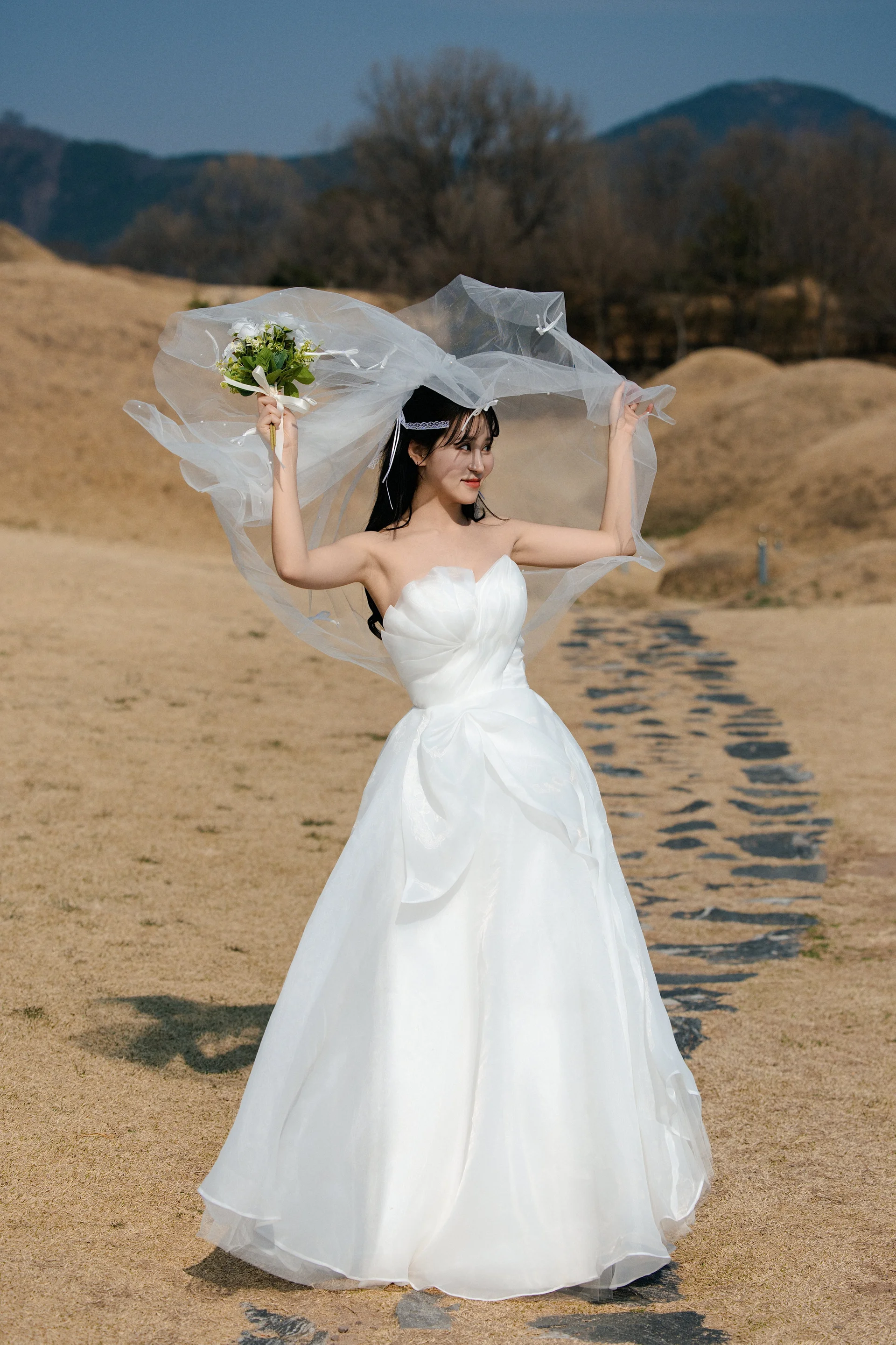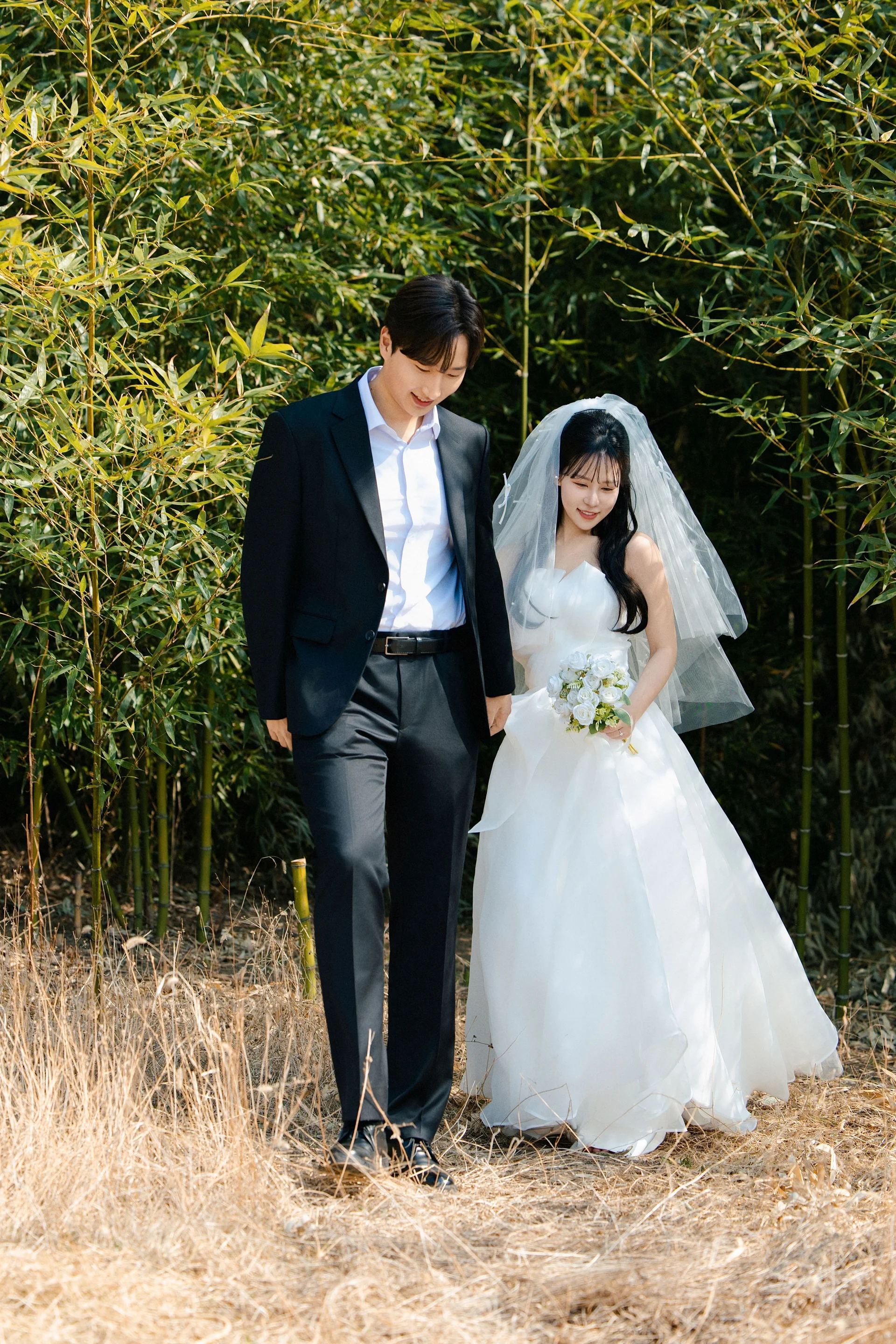 고분군 언덕 촬영에 이어 인근 대나무숲 촬영까지 병행하여 한 번의 촬영으로 시크함과 서정성을 동시에 확보합니다. 한 장소에서 다양한 무드를 담는 영리한 동선 설계는 바쁜 예비부부들에게 최고의 만족도를 선사합니다.