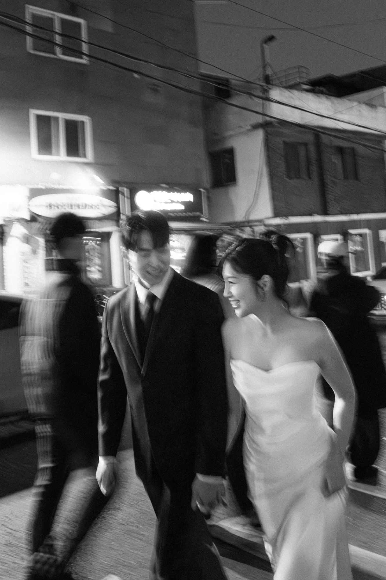 야외 이동과 좁은 보행로를 고려해 소품은 최소화하는 것이 좋습니다. 작은 부케나 빈티지 카메라 정도가 야경 무드와 잘 어우러집니다.