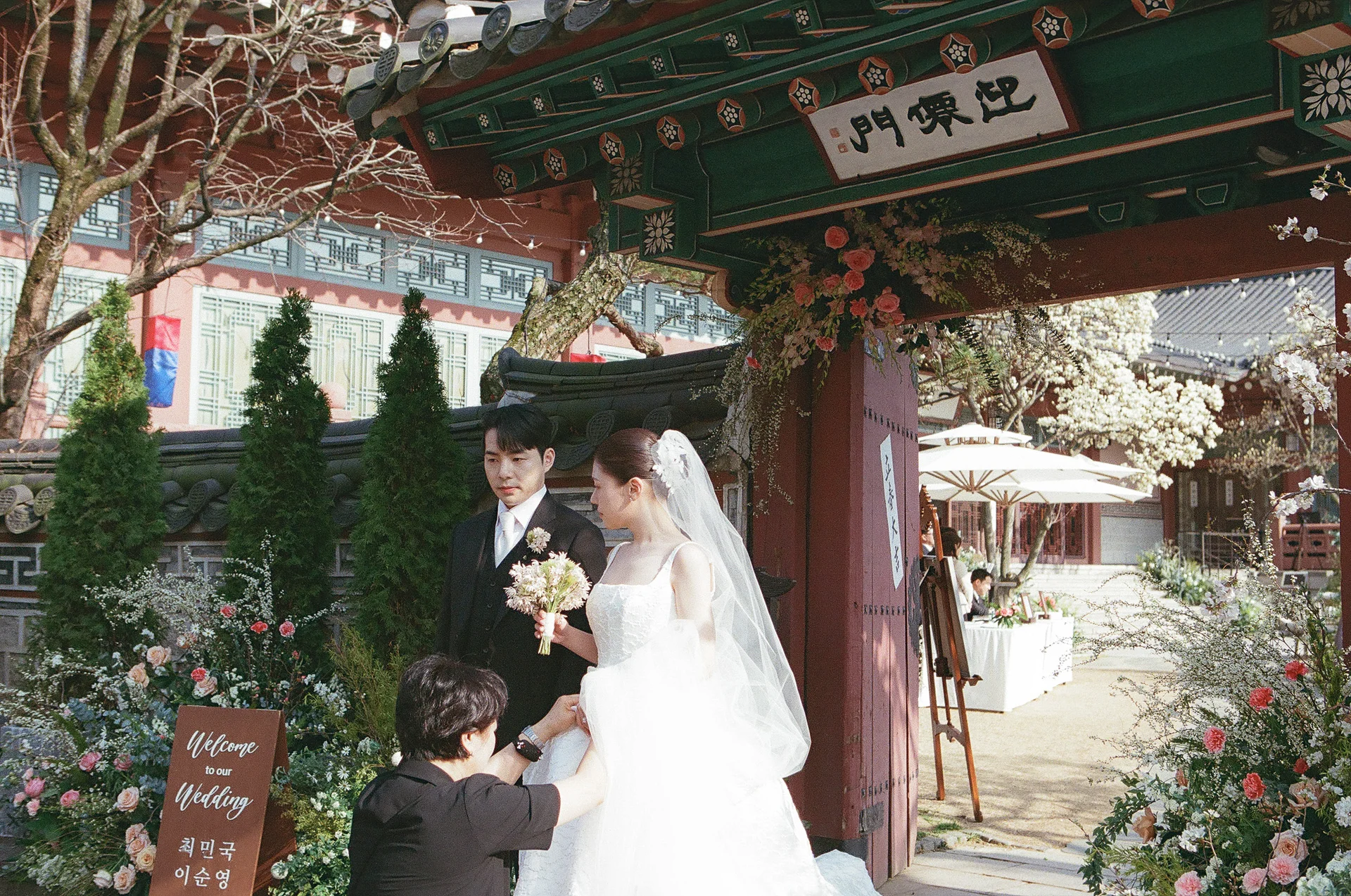 나라코드는 안정적인 디지털 촬영과 함께 빈티지한 아날로그 감성이 강조된 필름 카메라 촬영을 병행합니다. 특히 이번 삼청각 촬영에서는 필름 특유의 부드러운 입자감과 깊이 있는 색감을 활용해, 정형화되지 않은 야외 본식만의 자유로운 동선과 서정적인 분위기를 극대화했습니다.