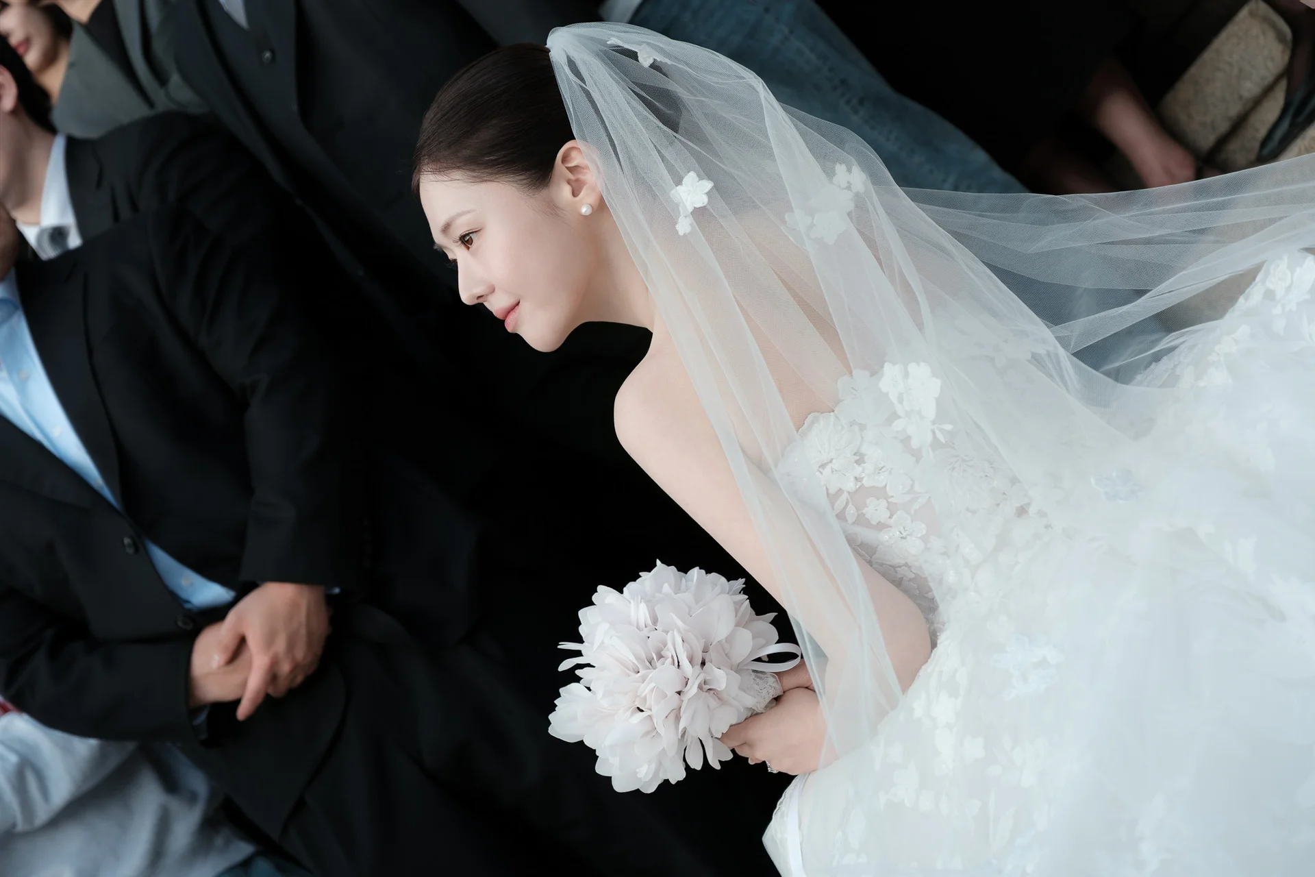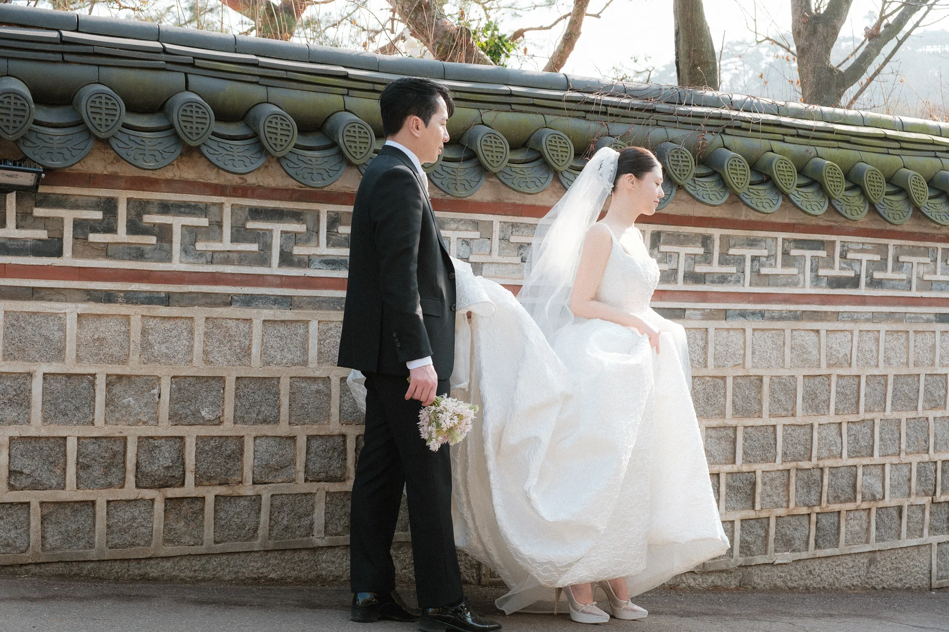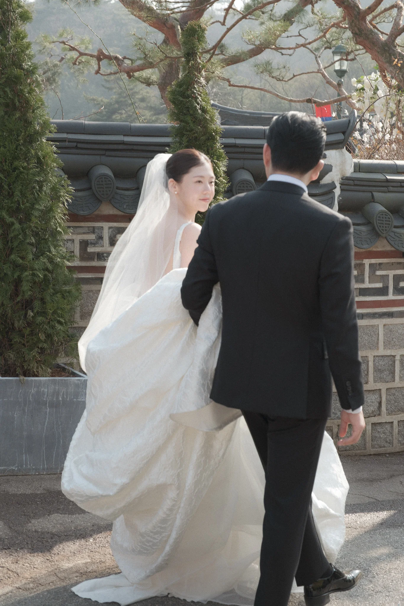 야외 한옥 웨딩은 바람의 영향이 큽니다. 베일의 길이나 드레스의 질감, 헤어 고정력 등을 작가와 미리 상의하여 바람에 흩날리는 모습까지 자연스러운 예술이 되도록 준비해 보세요.