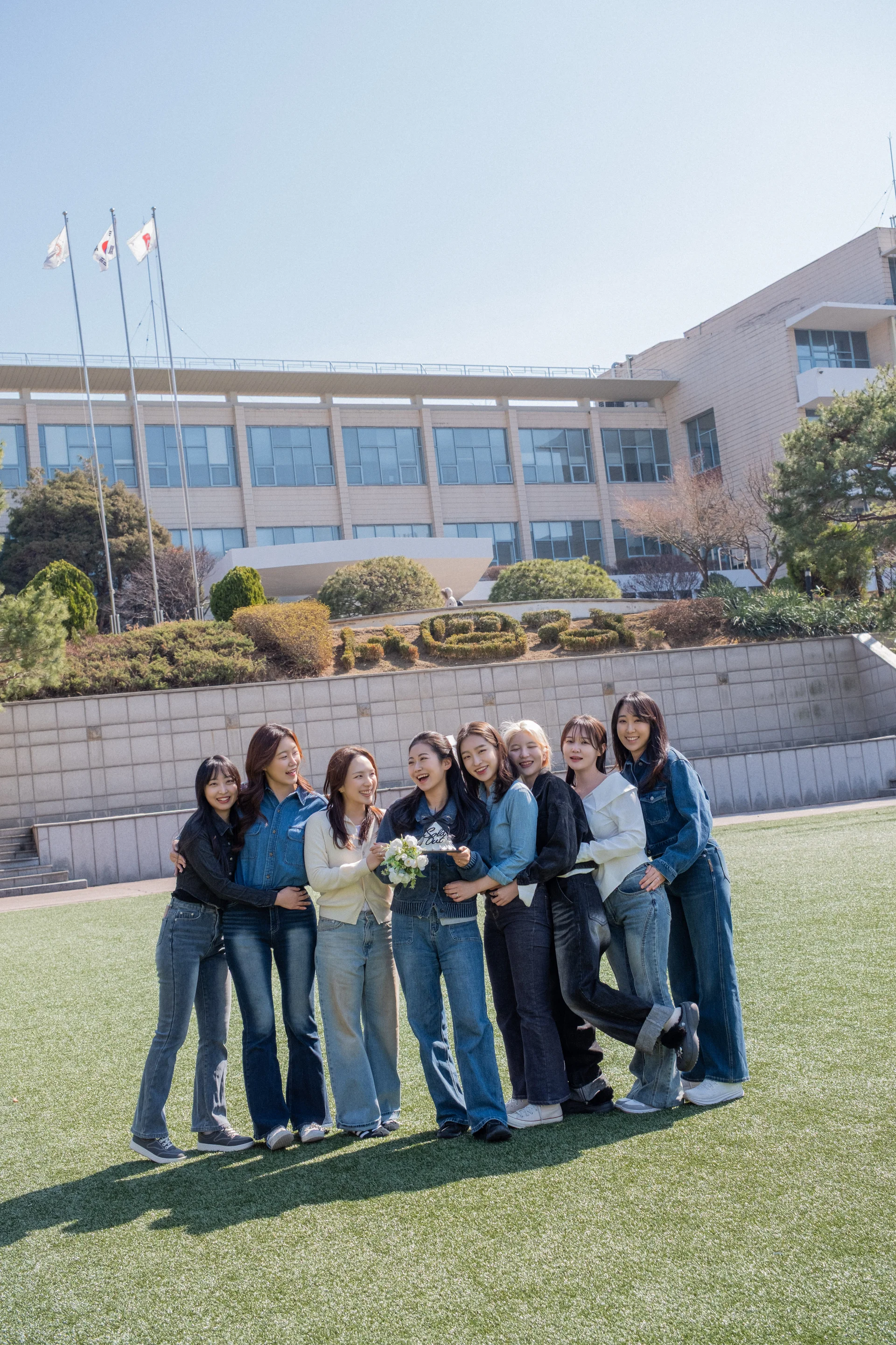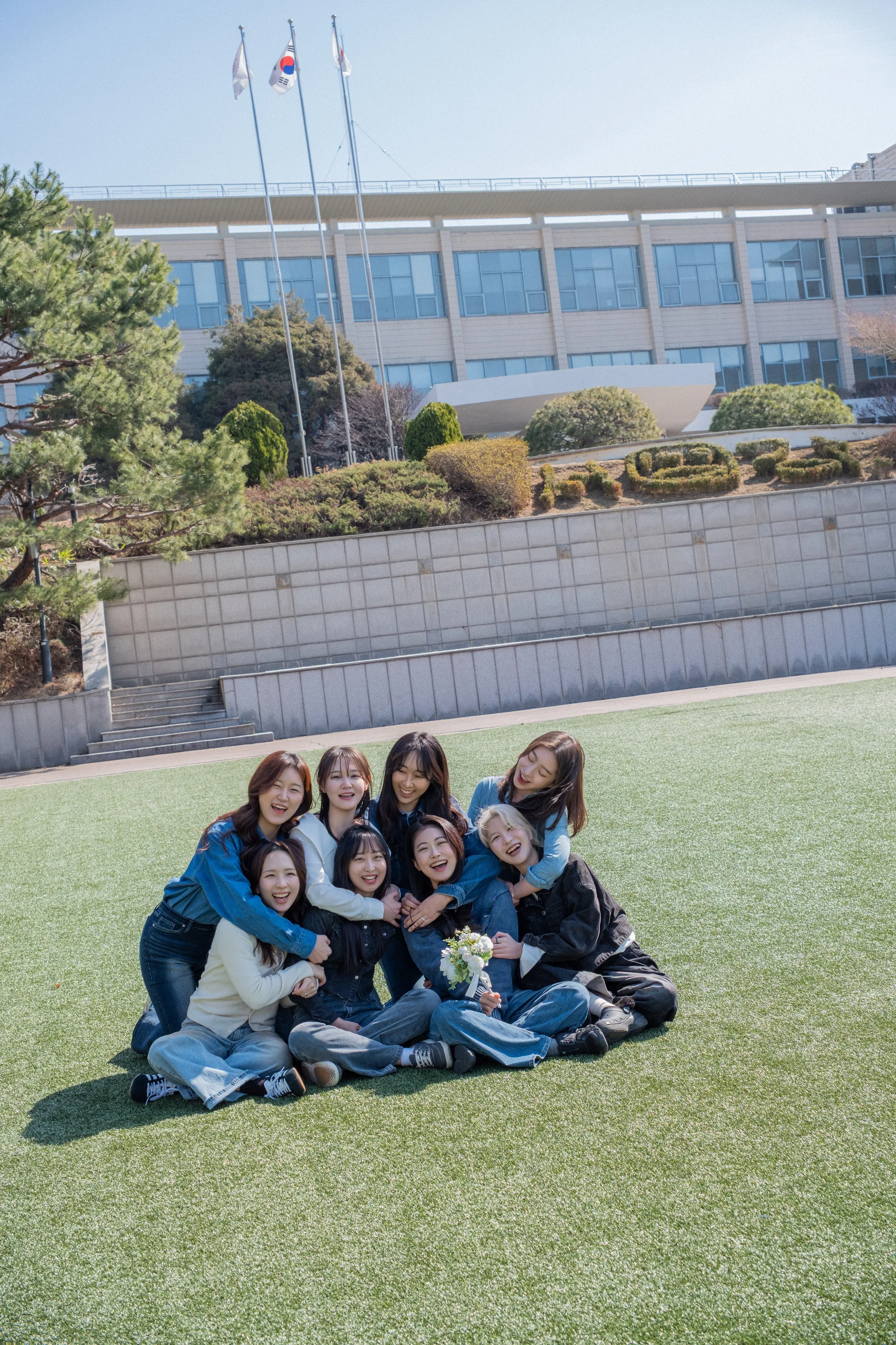 서강대학교의 랜드마크인 알바탑은 단체 인원을 안정적으로 배치하기에 가장 훌륭한 구도를 제공합니다. 이어지는 청년광장은 탁 트인 잔디밭 덕분에 정적인 포즈보다 뛰어오거나 자유롭게 앉아 웃는 동적인 장면을 담기에 최적입니다. 소유필름은 이 넓은 공간을 캔버스 삼아 8명의 친구가 사진 속에서 조화롭게 어우러지는 '황금 비율 배치'를 선사합니다.