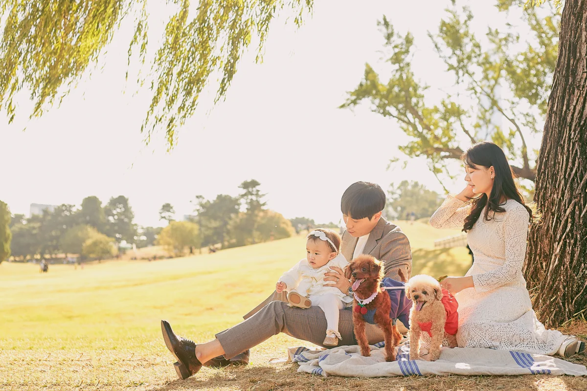 완벽하게 맞춘 유니폼 같은 복장보다 색감을 통일한 시밀러룩을 추천합니다. '청바지와 화이트 상의' 혹은 '파스텔 톤의 뉴트럴 컬러' 조합은 야외의 초록색 배경과 완벽하게 어우러지며, 인물의 피부 톤을 화사하게 살려줍니다. 편안한 신발은 즐거운 촬영을 위한 필수 준비물입니다.