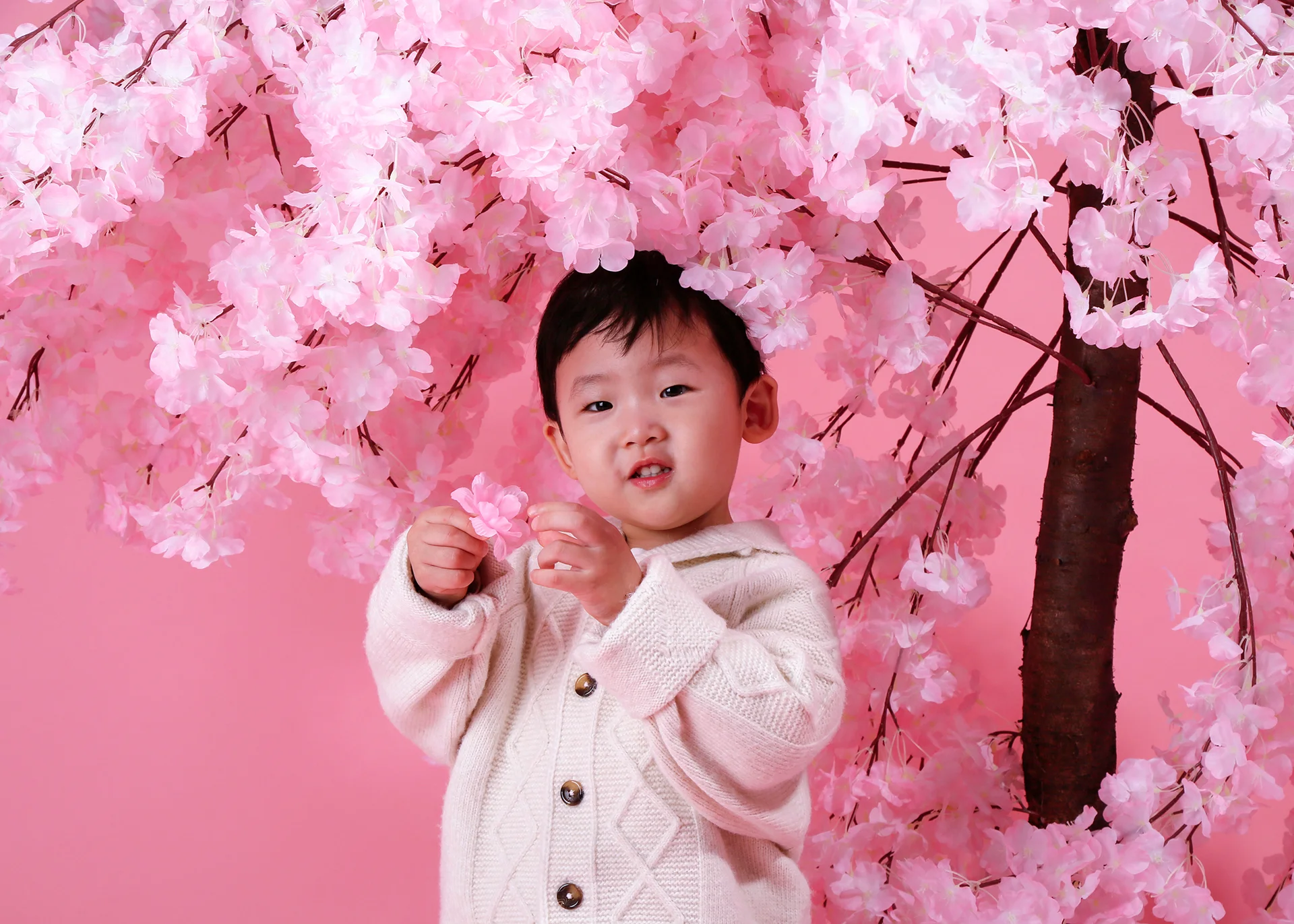 로그스튜디오의 벚꽃 세트장은 인위적인 원색보다는 부드러운 파스텔 핑크 톤으로 구성되어 있습니다. 이는 사진 전체의 분위기를 따뜻하게 정리해 줄 뿐만 아니라, 조명을 받았을 때 아이의 피부 톤을 맑고 투명하게 부각하는 반사판 역할을 합니다. 계절의 감성과 인물의 매력이 완벽하게 어우러지는 최적의 환경입니다.