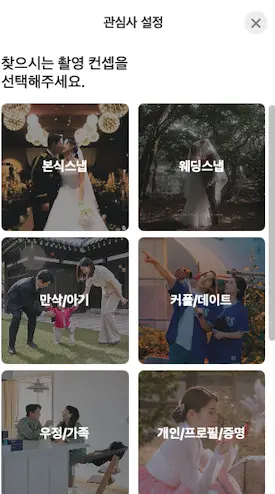 테마별 필터링 가능 (웨딩스냅, 돌스냅, 커플스냅, 우정스냅, 졸업스냅 등)