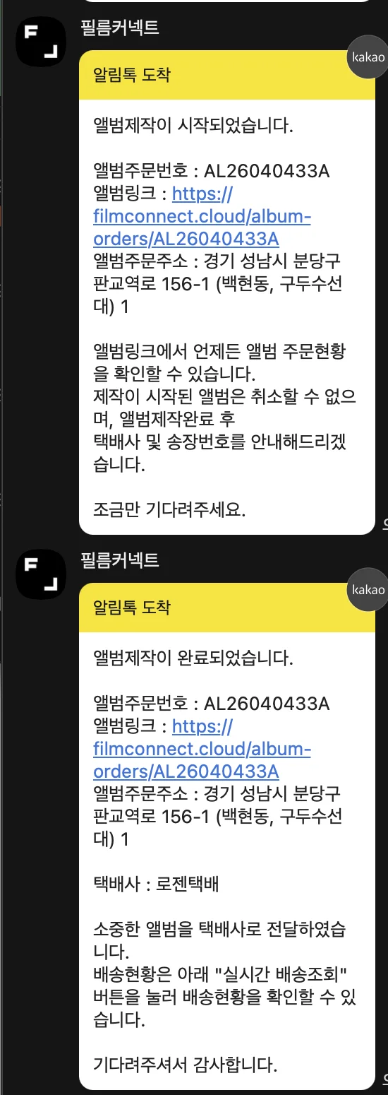 모든 제작 단계가 카카오톡으로 안내됩니다. 작가님과 번거로운 메시지를 주고받을 필요 없이 시스템 안에서 모든 확인이 완료되므로 소통의 피로도가 획기적으로 낮아집니다.