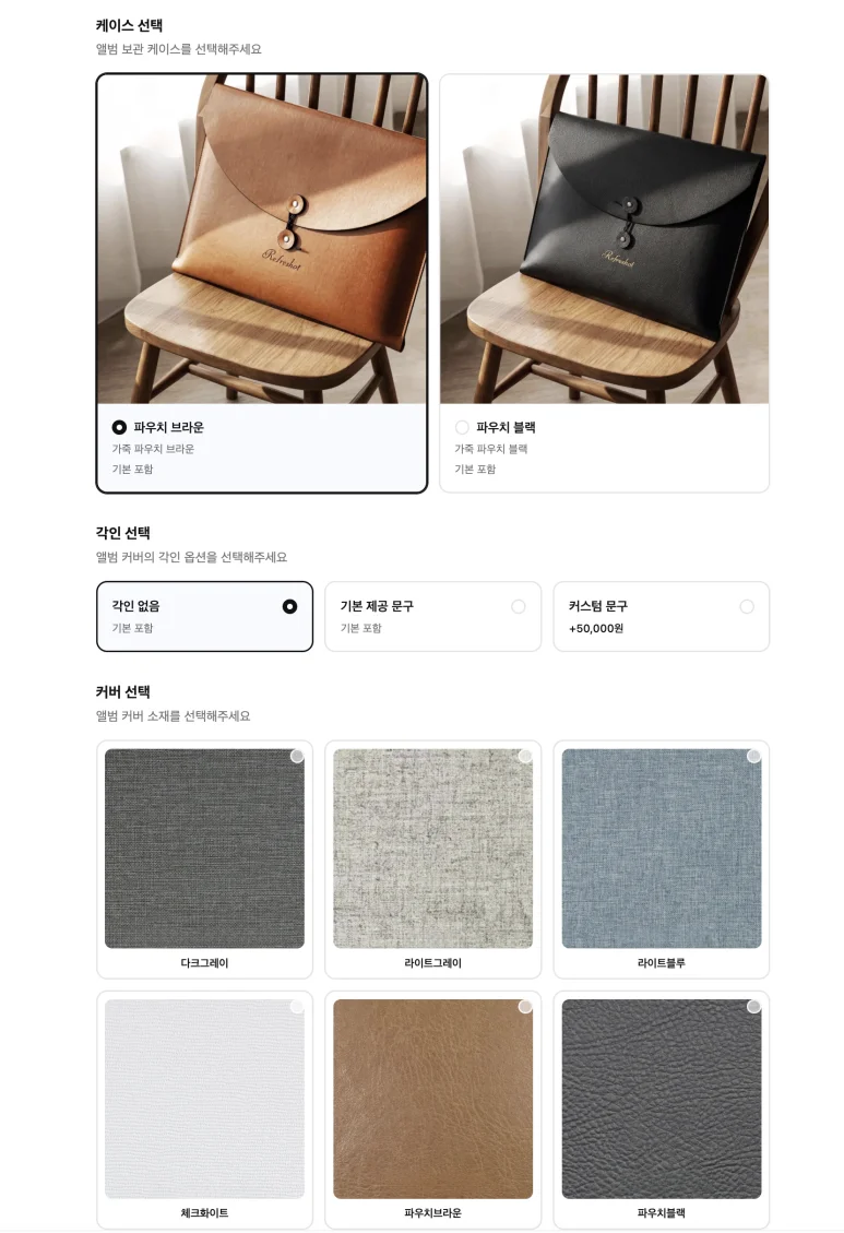 • 화보앨범: 압축앨범 대비 더 많은 장수를 제공하며, 180도 레이플랫(Lay-flat) 구조로 몰입감이 뛰어납니다. (압축앨범보다 약 1만 원 저렴)