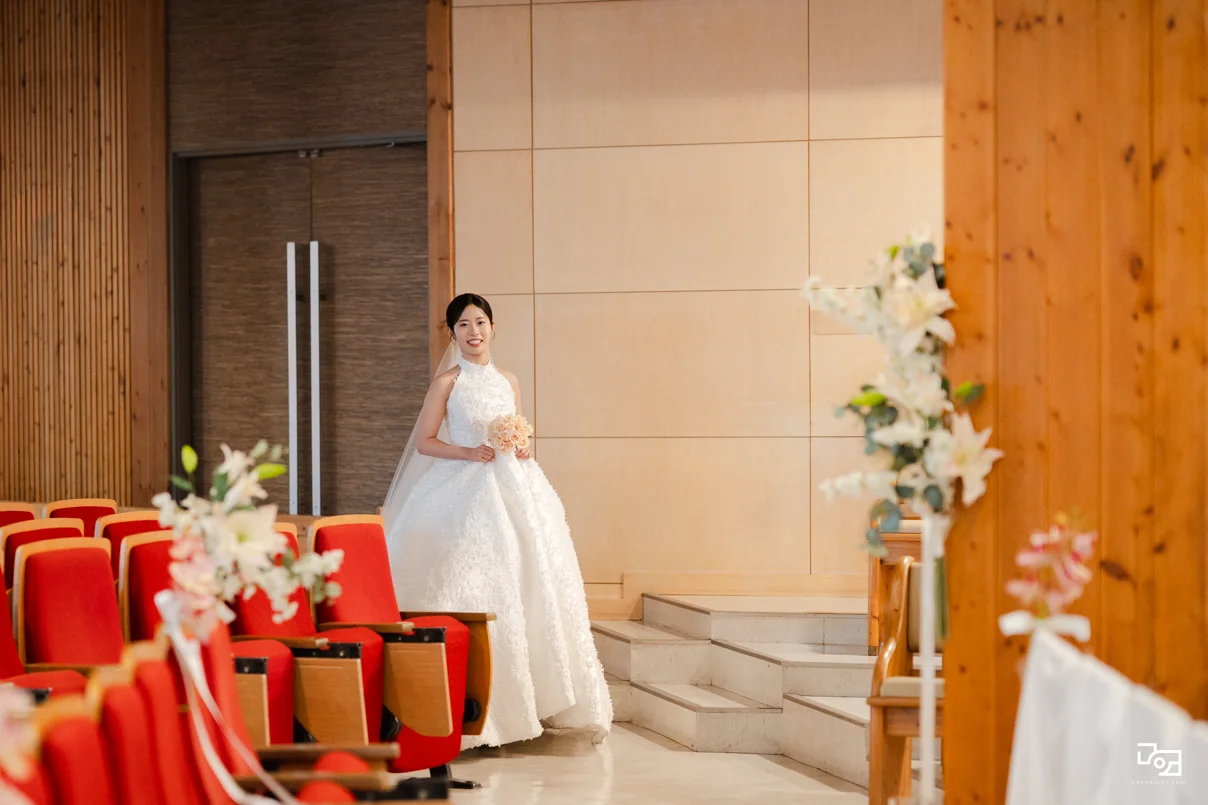 기술의 차이: 일반 웨딩홀의 인위적인 핀 조명보다 예배당의 차분한 빛은 오히려 인물을 맑고 쨍하게 표현하기에 훌륭한 재료가 됩니다. 작가님만의 노하우로 선명도와 색감을 모두 잡은 ‘은혜로운’ 결과물을 약속드립니다.