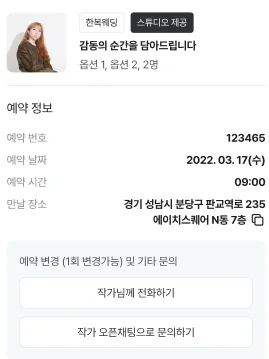 촬영에 온신경을 기울이고 있는 사진작가와 이런 기본적인 질문들만 주고받는 데도 하루 이틀이 걸립니다. 그러다보면 자연스레 예약이 밀릴 수 있고 답변을 듣다 차선도 놓치는 경우가 생길 수 있었죠..