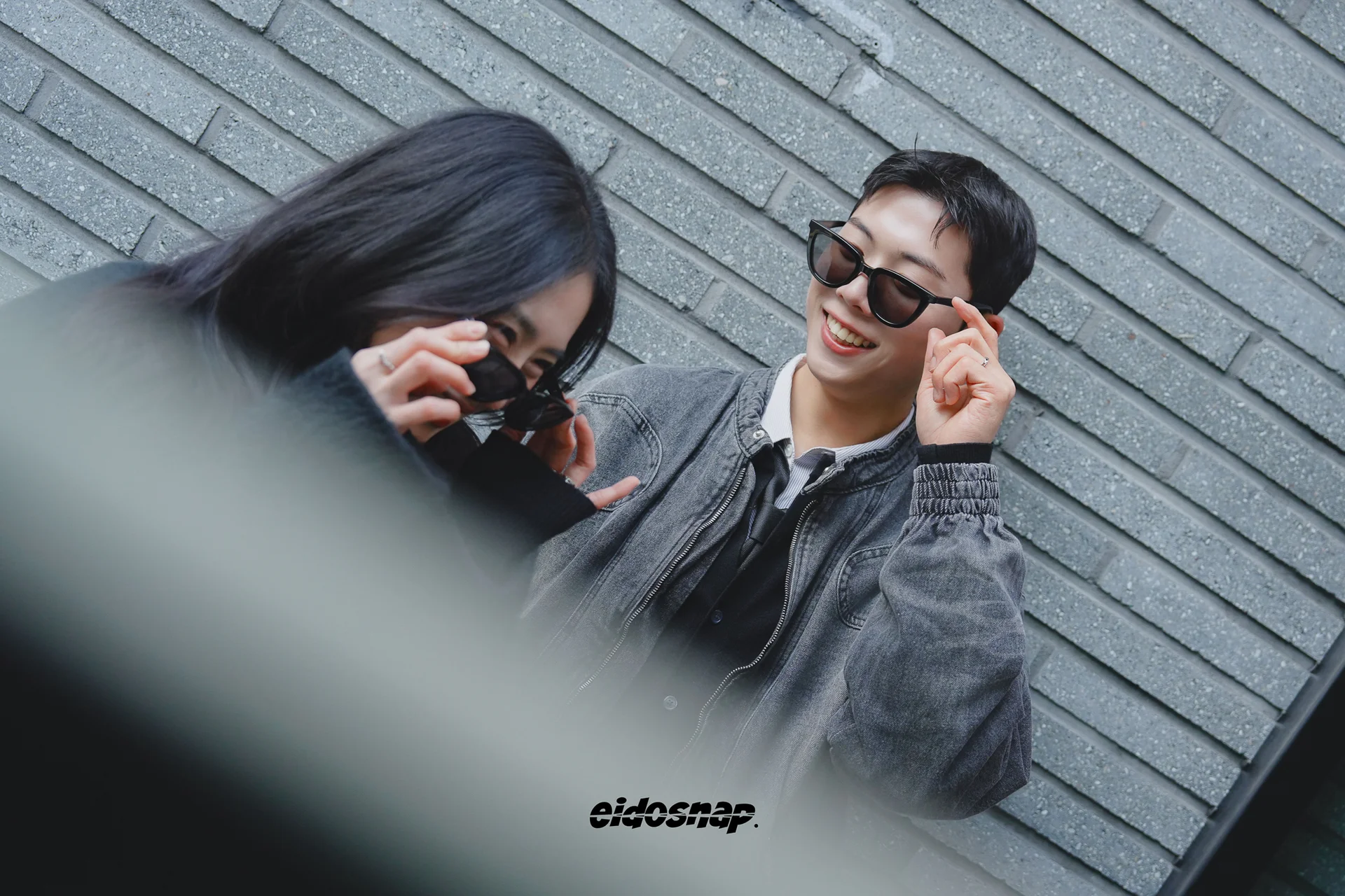 도시의 질감 활용: 무심하게 서 있는 모습 속에서 드러나는 도시적인 분위기, 선글라스를 활용한 힙한 연출 등은 평범한 데이트 스냅을 한 권의 패션 화보로 바꿔줍니다.