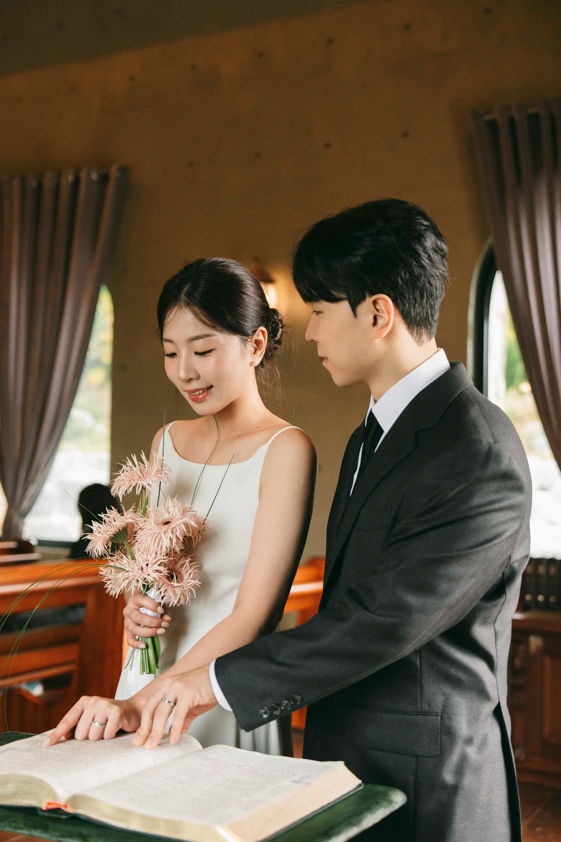 소품 추천: 웨딩밴드, 성경책, 부케 등 의미를 담은 소품을 준비하면 좋습니다.