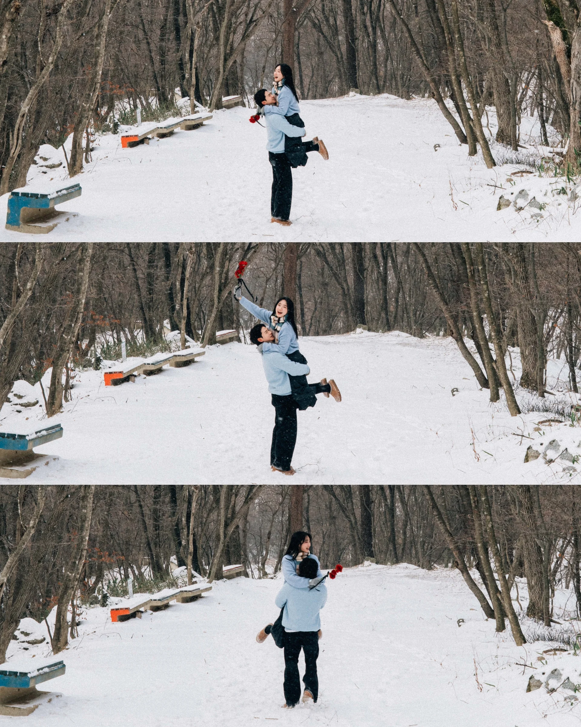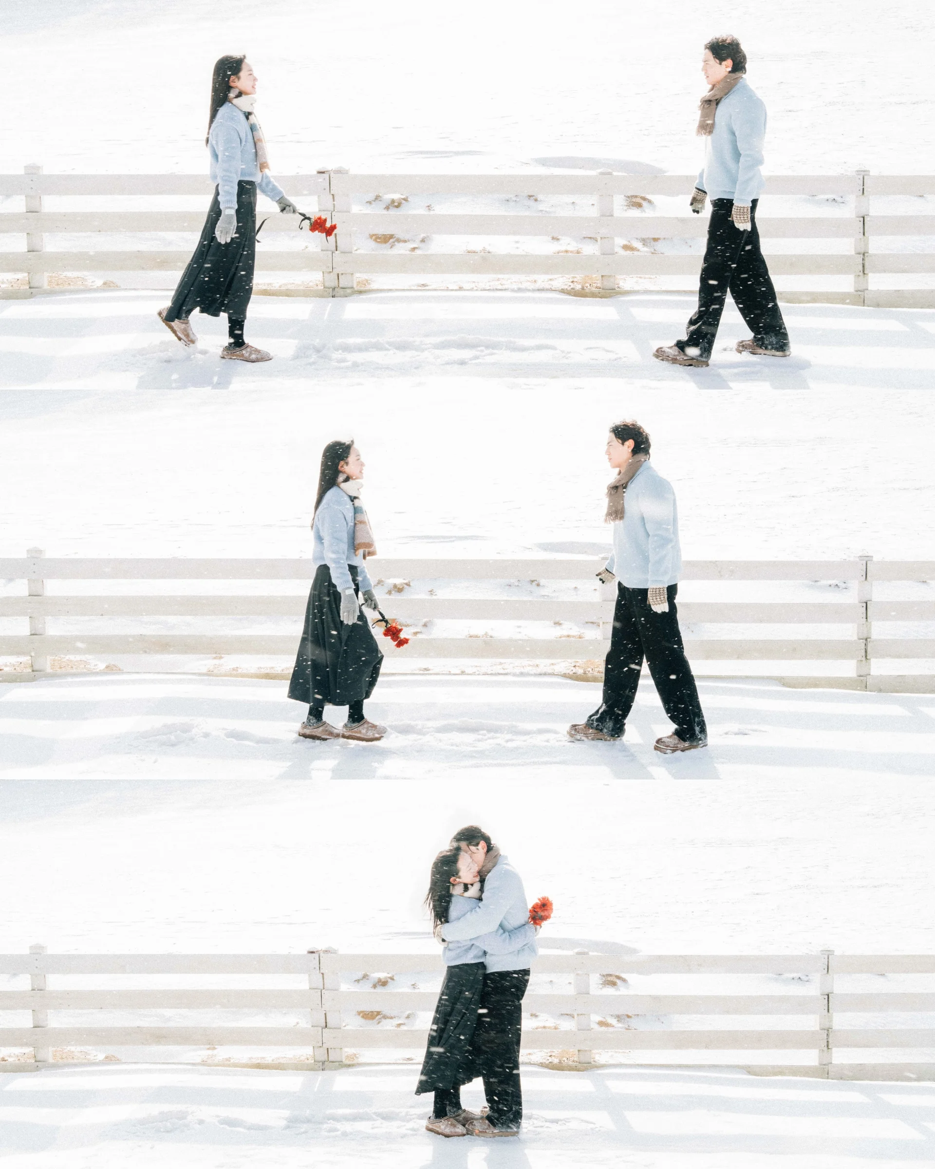 방한 아이템의 활용: 커플 장갑, 니트 목도리, 비니 등은 추위를 막아줄 뿐만 아니라 그 자체로 귀엽고 포근한 스냅 소품이 됩니다.