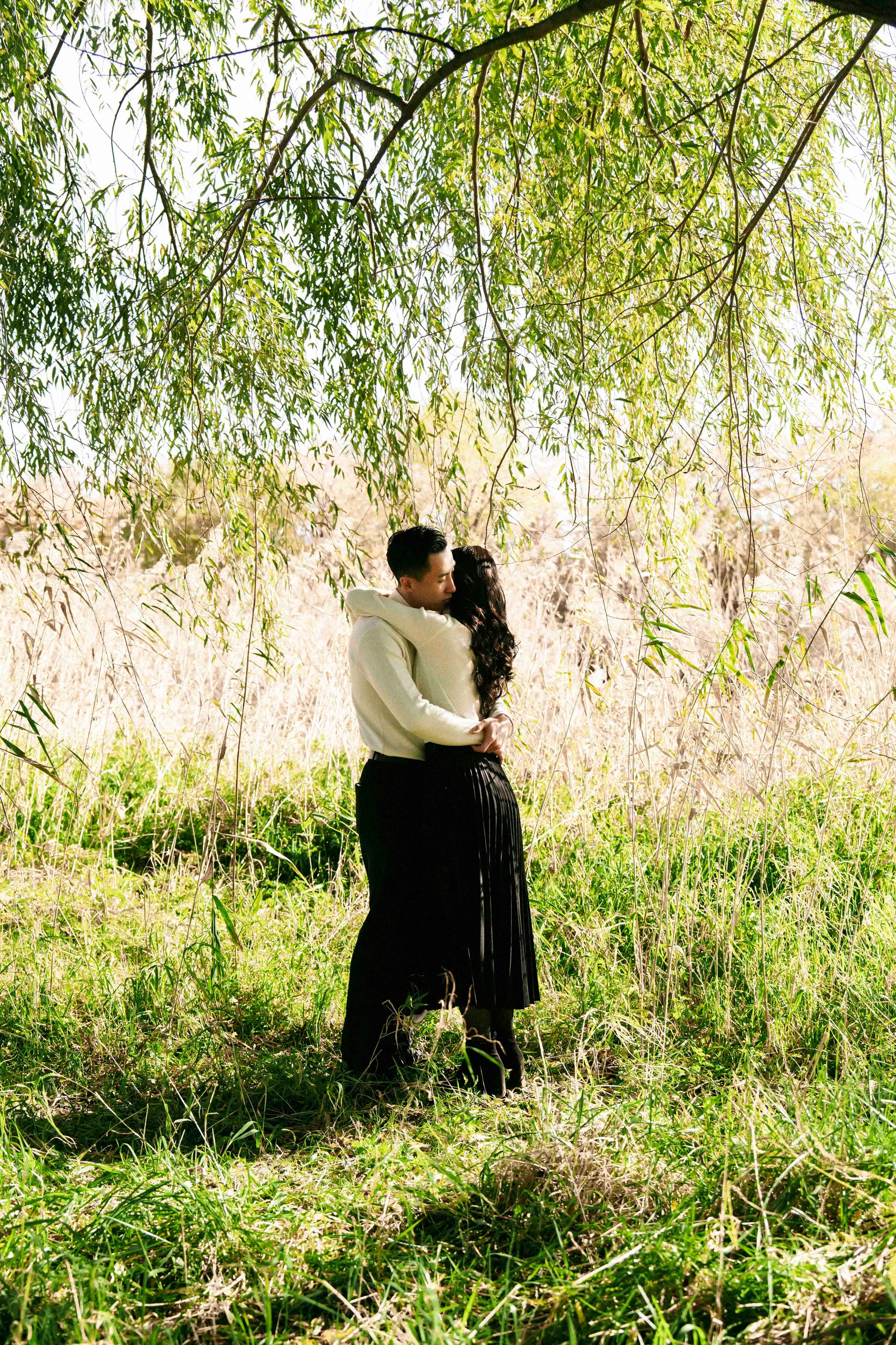 아직 떨어지지 않은 나뭇잎이 햇살을 적절히 가려주어 은은한 그림자를 만듭니다. 이는 차분하고 깊이 있는 사진 구도를 만들어주며, 과한 포즈 없이 서로를 바라보는 것만으로 충분한 무드를 자아냅니다.