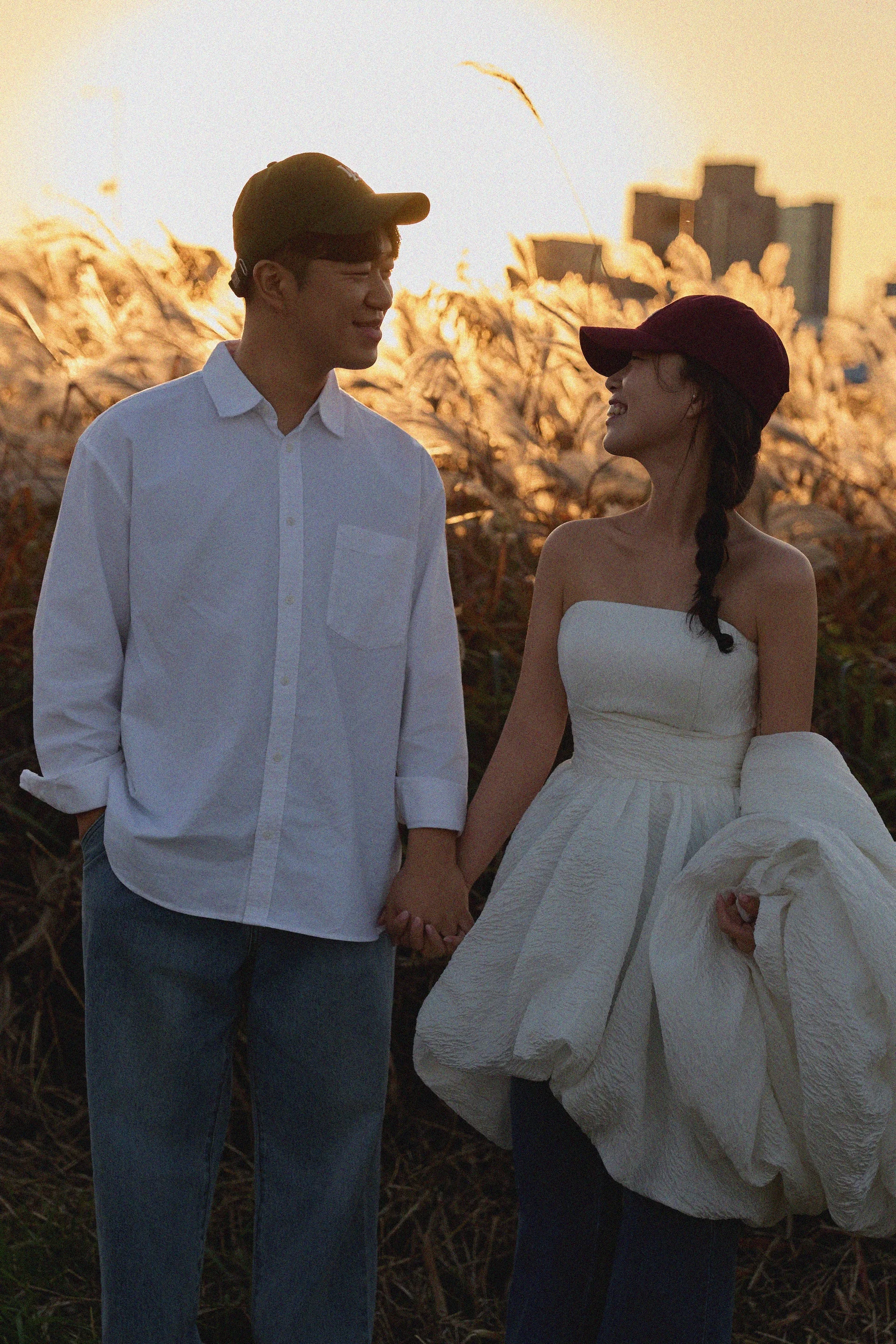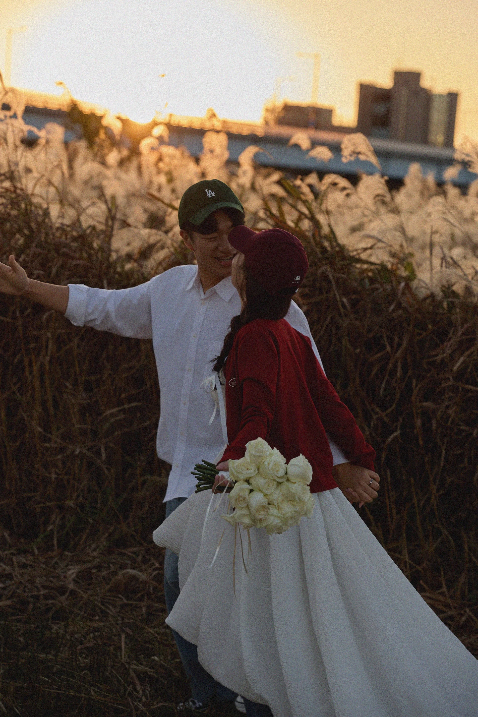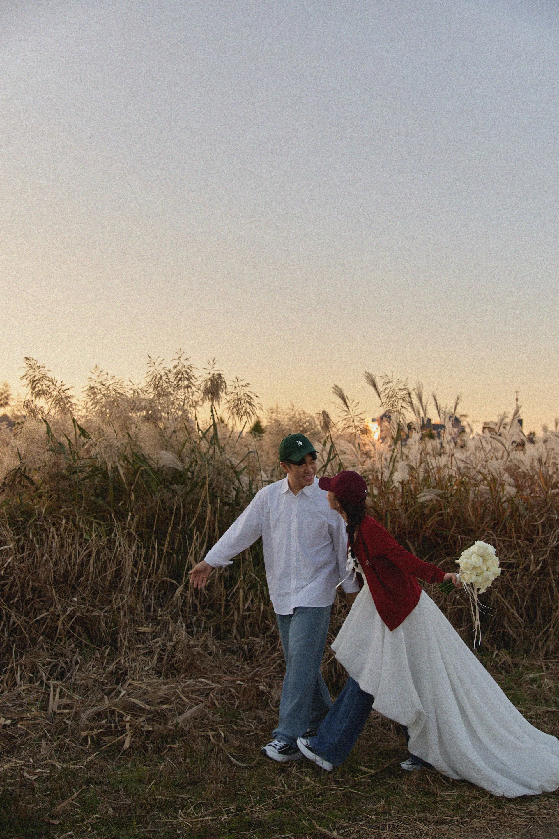 갈대밭에서는 격식보다는 ‘우리다운 편안함’에 집중했습니다. 신부님은 드레스에 청바지를 믹스매치하고 가디건으로 포인트를 주어 싱그러운 느낌을 살렸고, 신랑님 역시 청바지 시밀러룩으로 조화를 이루었습니다. 따뜻한 햇살 아래 웃고 장난치는 자연스러운 모습들이 가득 담겼습니다.