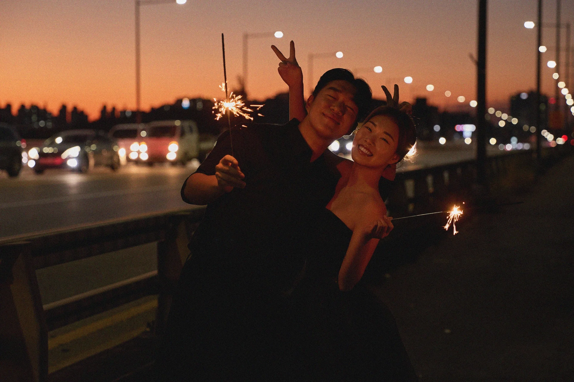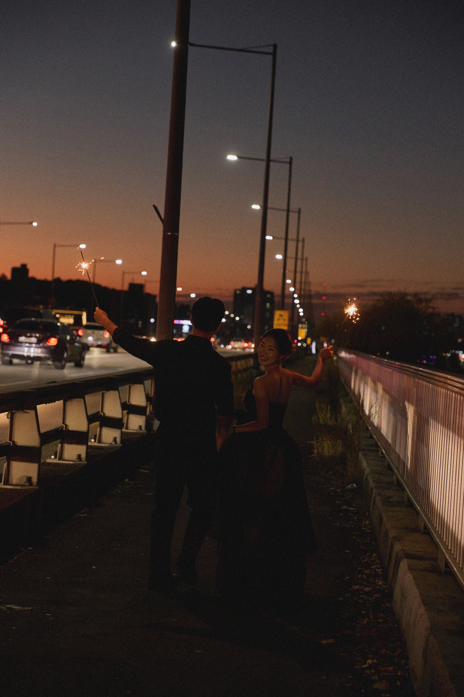 밤이 되면 산동교 위에서 극적인 분위기 반전을 시도합니다. 두 분 모두 블랙 의상으로 환복하여 무게감 있는 무드를 연출했으며, 스파클라(불꽃놀이) 소품을 활용해 낭만적인 빛의 궤적을 사진에 담았습니다.
