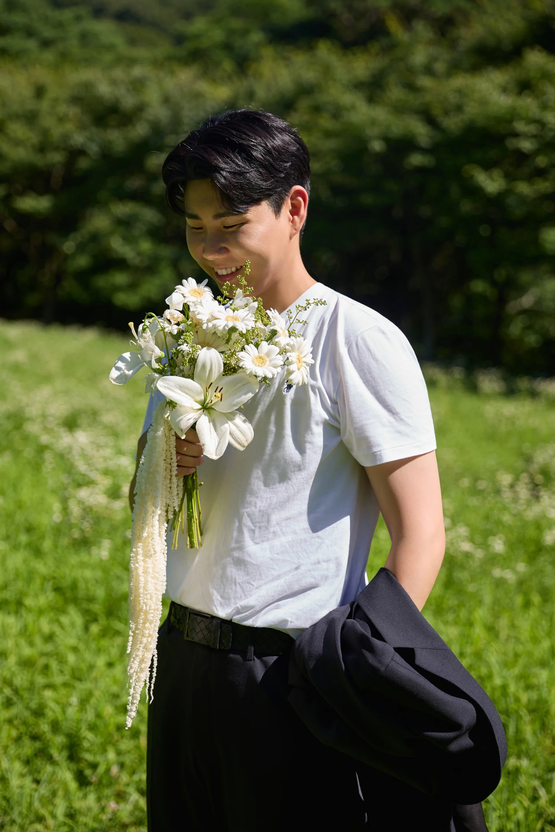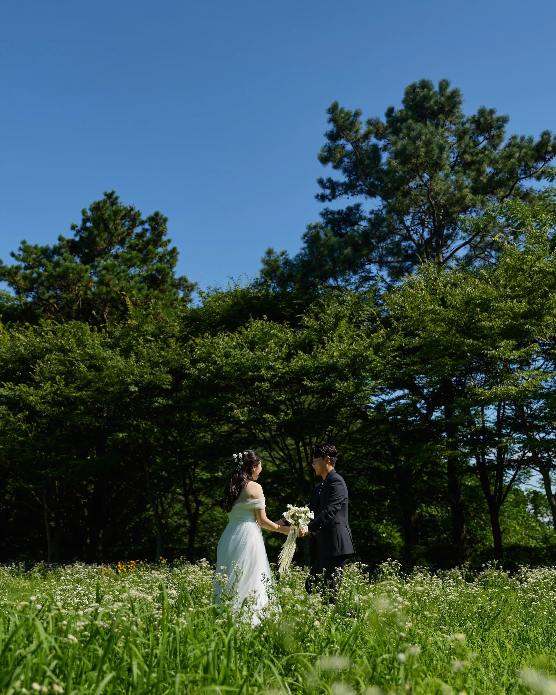감성 포인트: 신랑님이 들꽃 부케를 직접 들고 있는 장면에서 살짝 부끄러운 듯한 미소를 지어, 광주 근교 야외웨딩스냅에서만 가능한 사랑스러운 분위기가 완성되었습니다.