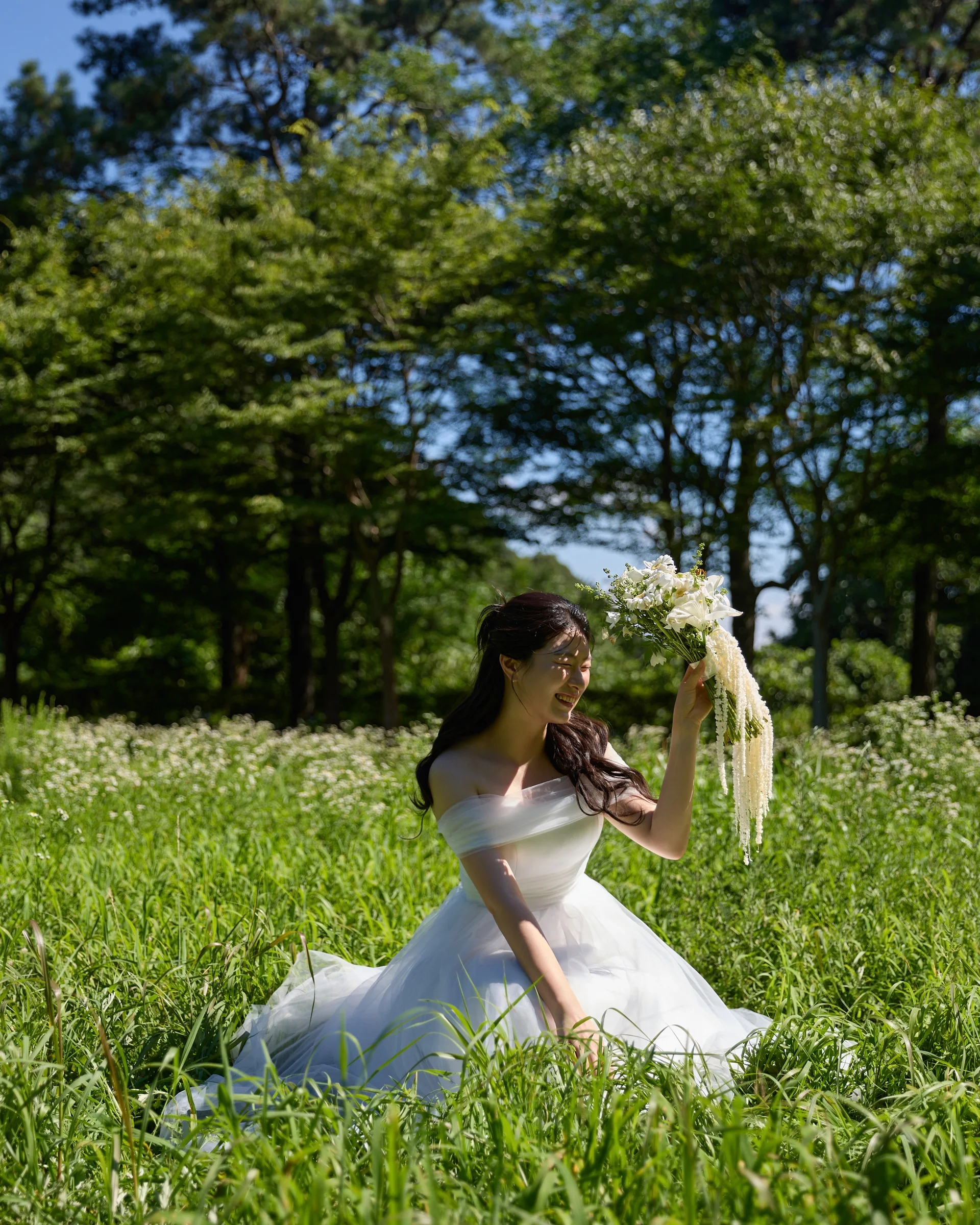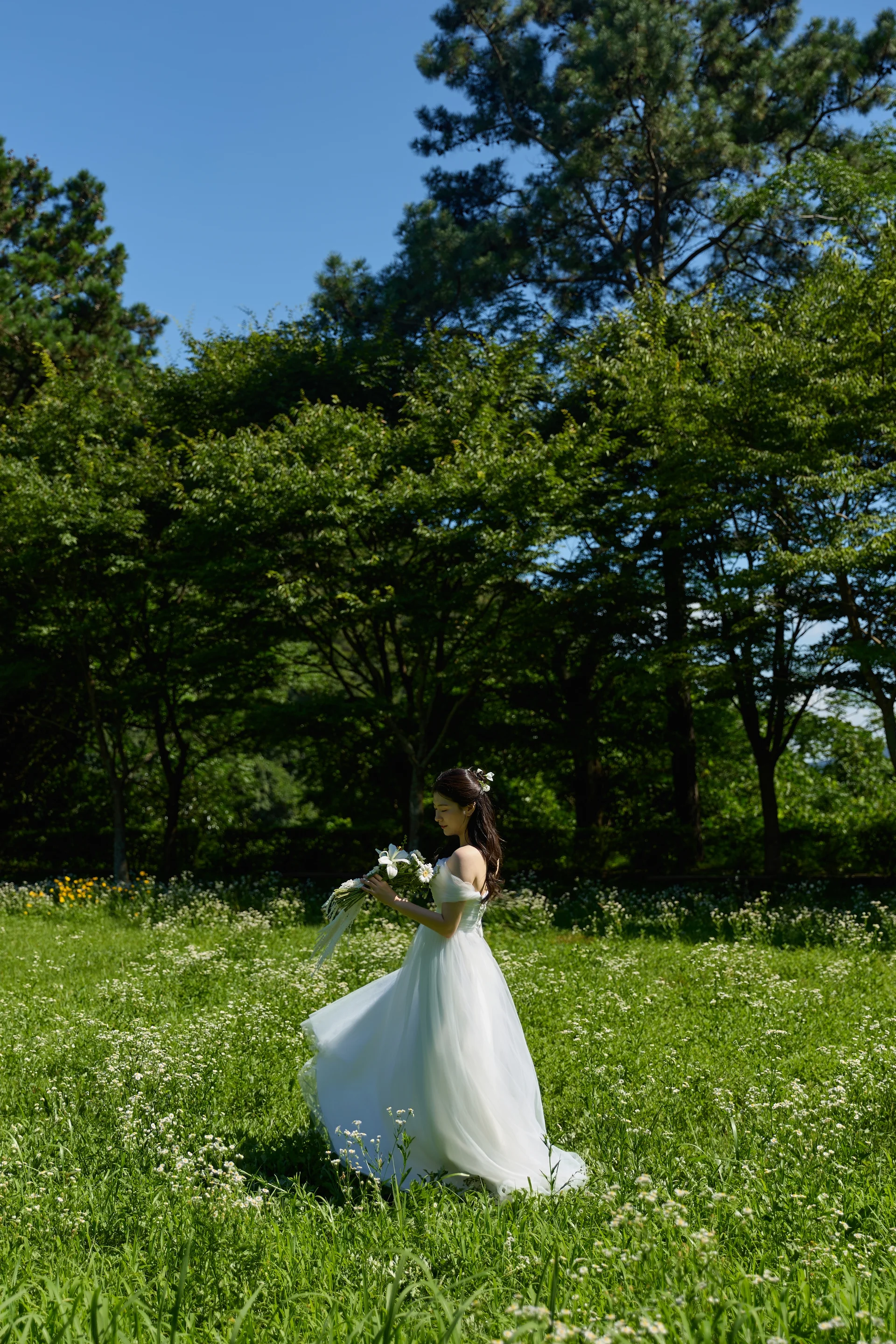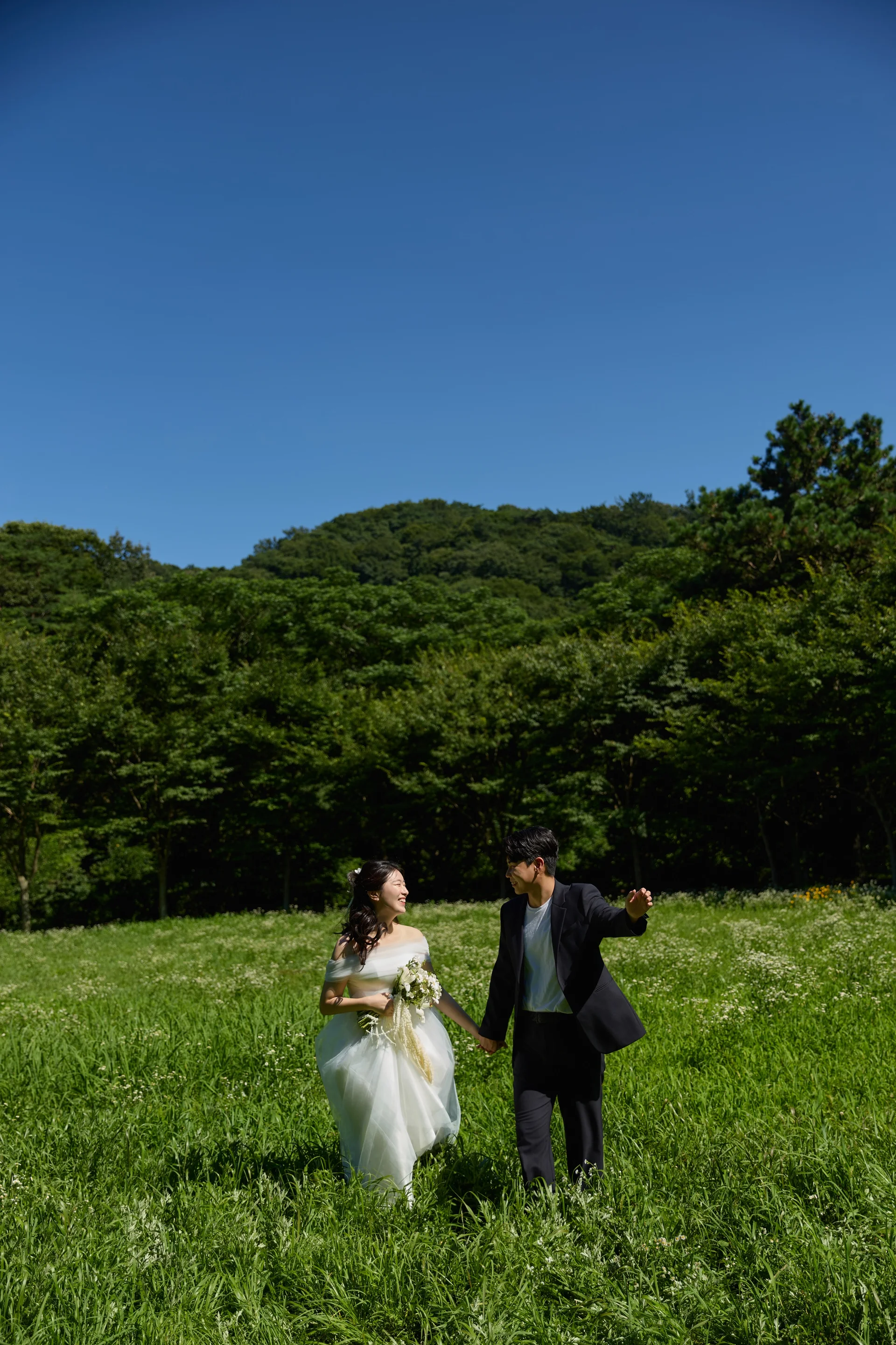 하늘과 산이 한눈에 들어오는 넓은 들판 위에서 신부님이 드레스를 들고 걷는 모습은 영화 같은 장면을 연출합니다. 햇빛이 강하지 않은 시간대를 택하면 부드럽고 몽환적인 느낌을 연출할 수 있습니다.