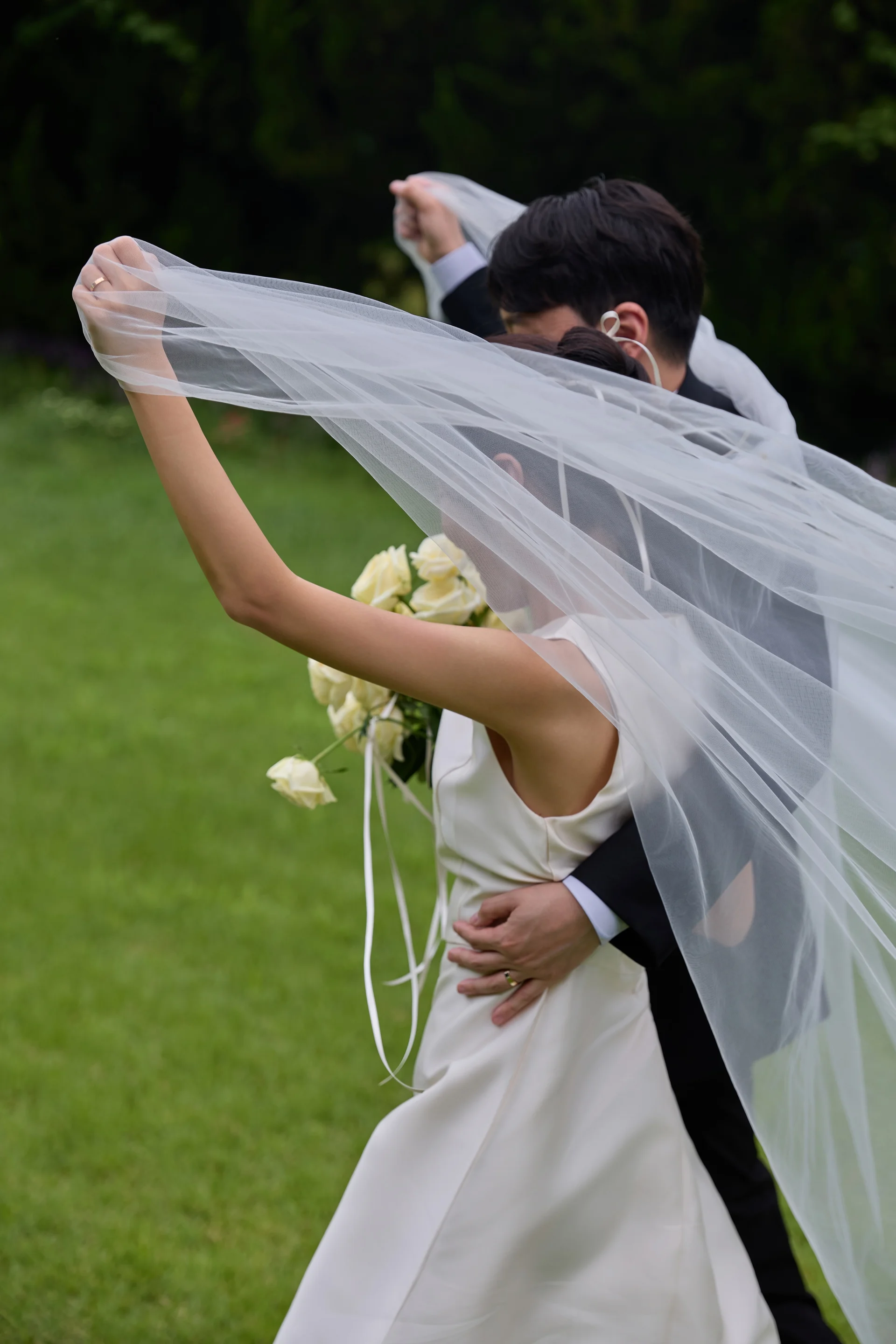 신랑님과 베일을 함께 머리 위로 써서 두 사람만의 공간을 만드는 컷.
