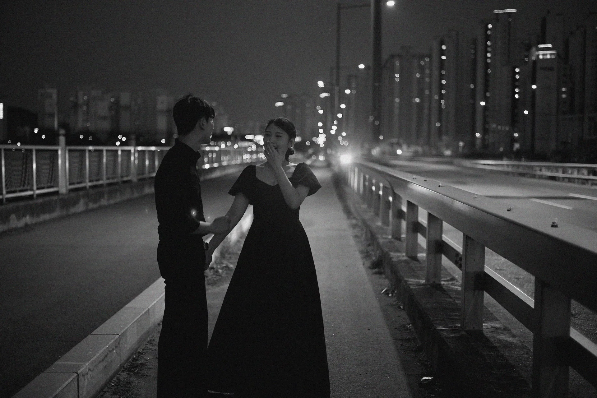 • 역동적인 연출: 첨단대교는 인도가 넓어 손을 잡고 뛰거나 걷는 활동적인 무드를 담기에 최적입니다. 야간 촬영 특성상 안전에 유의하며 진행되었으며, 어둠 속에서 빛나는 블랙 드레스의 실루엣은 현장의 모든 이들을 감탄하게 했습니다.