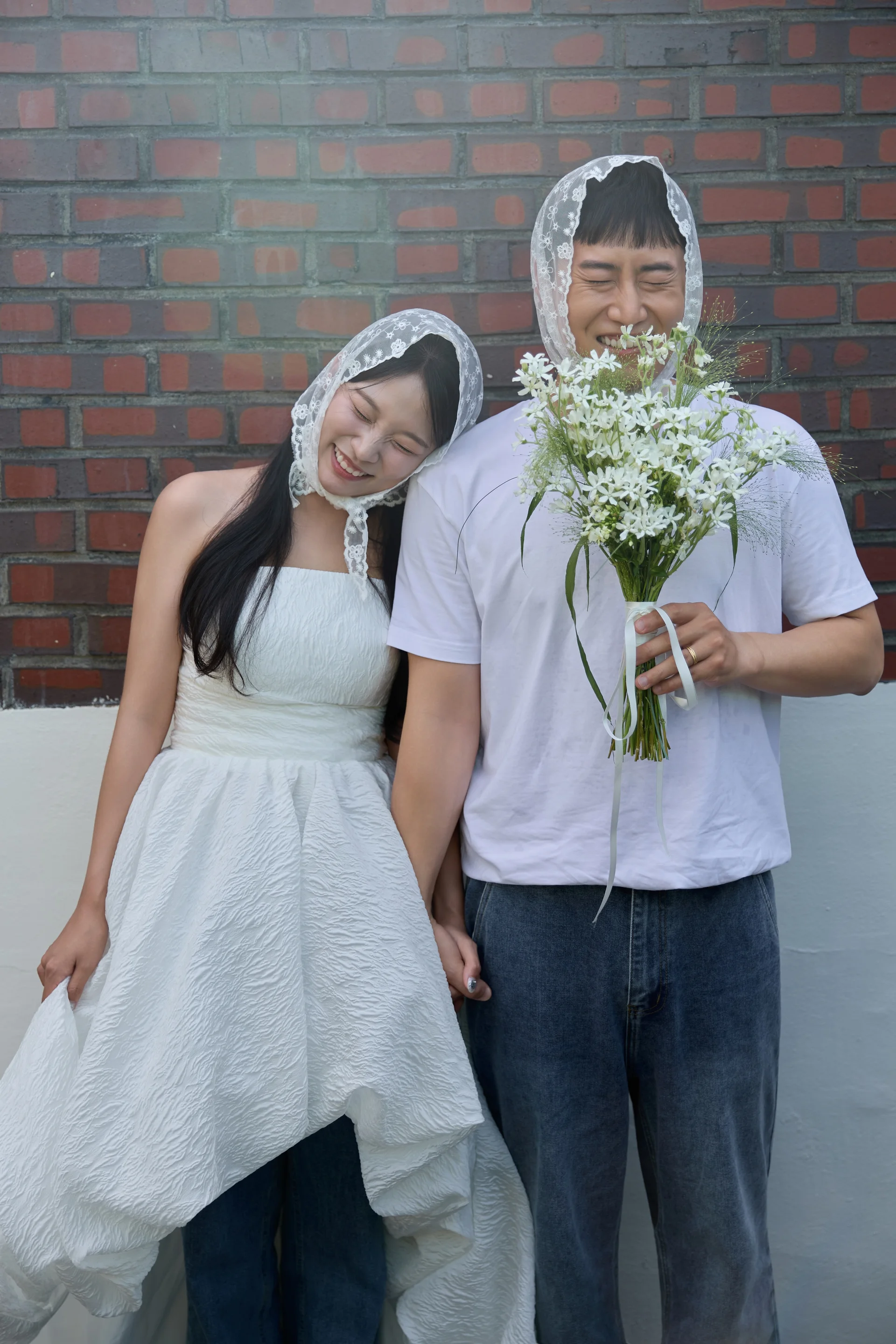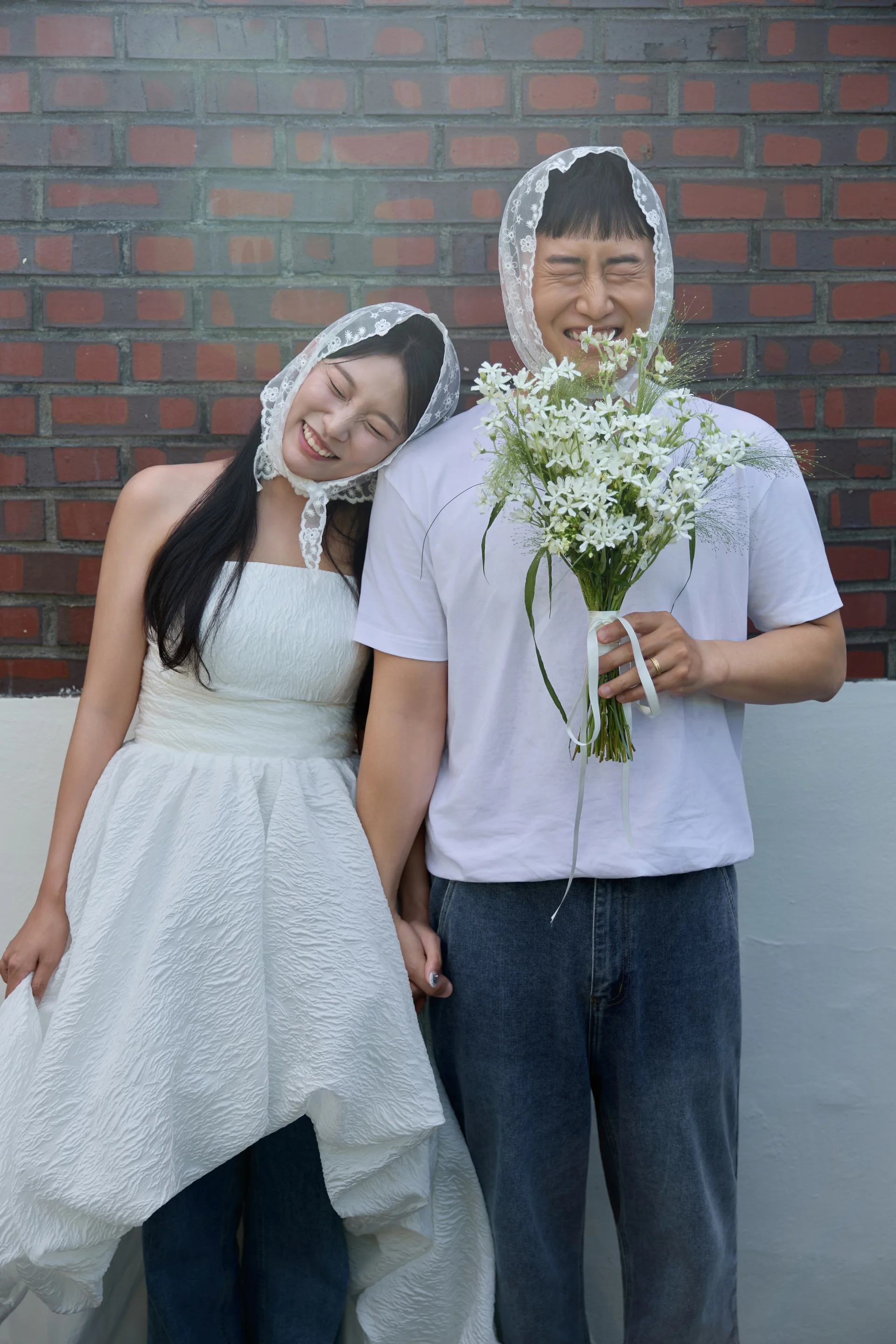 • 효과: 신부님이 직접 챙겨온 레이스 두건은 웨딩드레스 느낌과 잘 어울려 사랑스럽고 빈티지한 분위기를 더해줬고, 신랑님도 함께 두건을 착용하면서 그림 같은 커플컷이 완성되었습니다.
