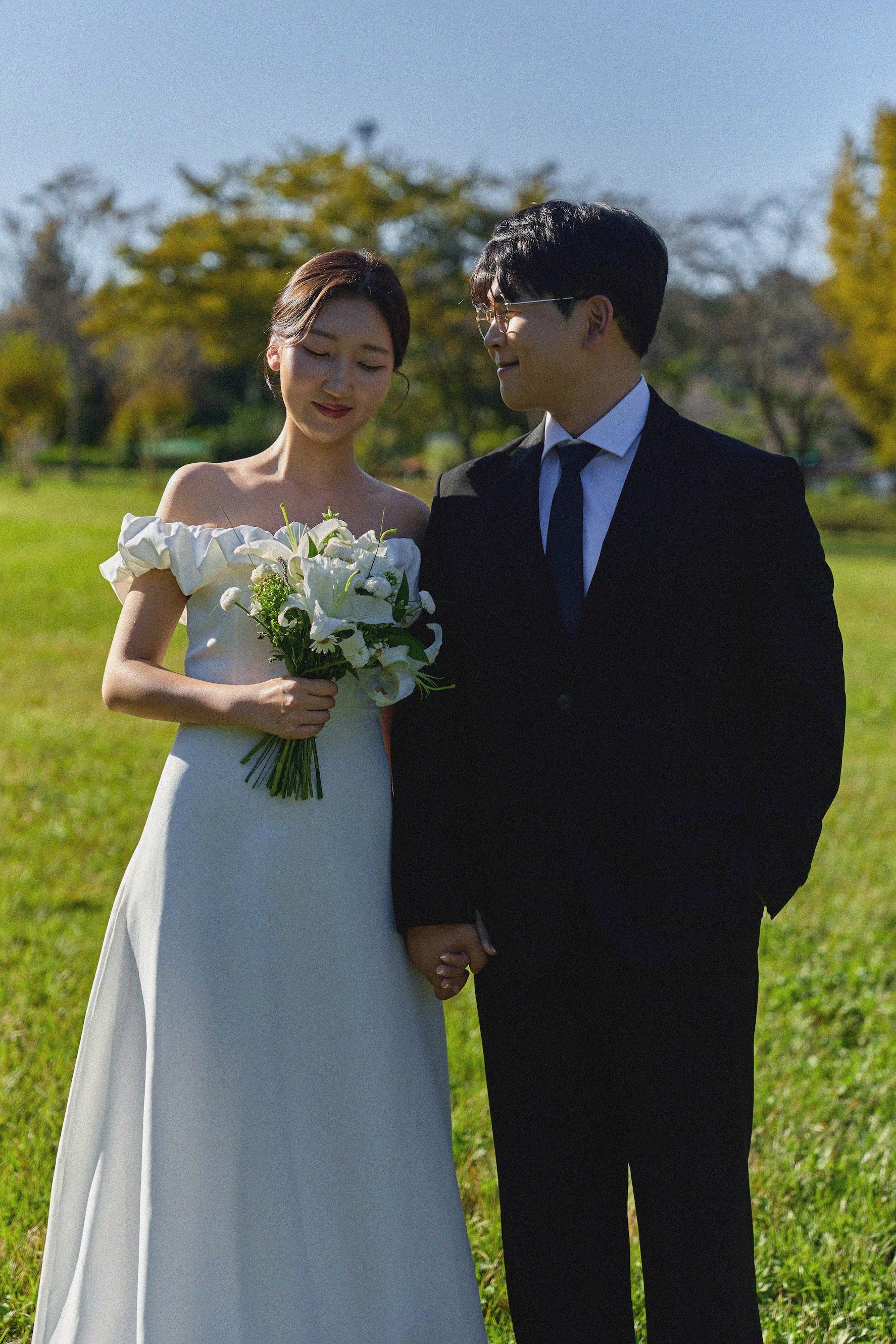 의상 가이드: 신부님은 우아한 A라인 화이트 드레스, 신랑님은 블랙 수트를 선택했습니다. 초록 배경과 블랙&화이트의 대비는 언제나 실패 없는 정석입니다.