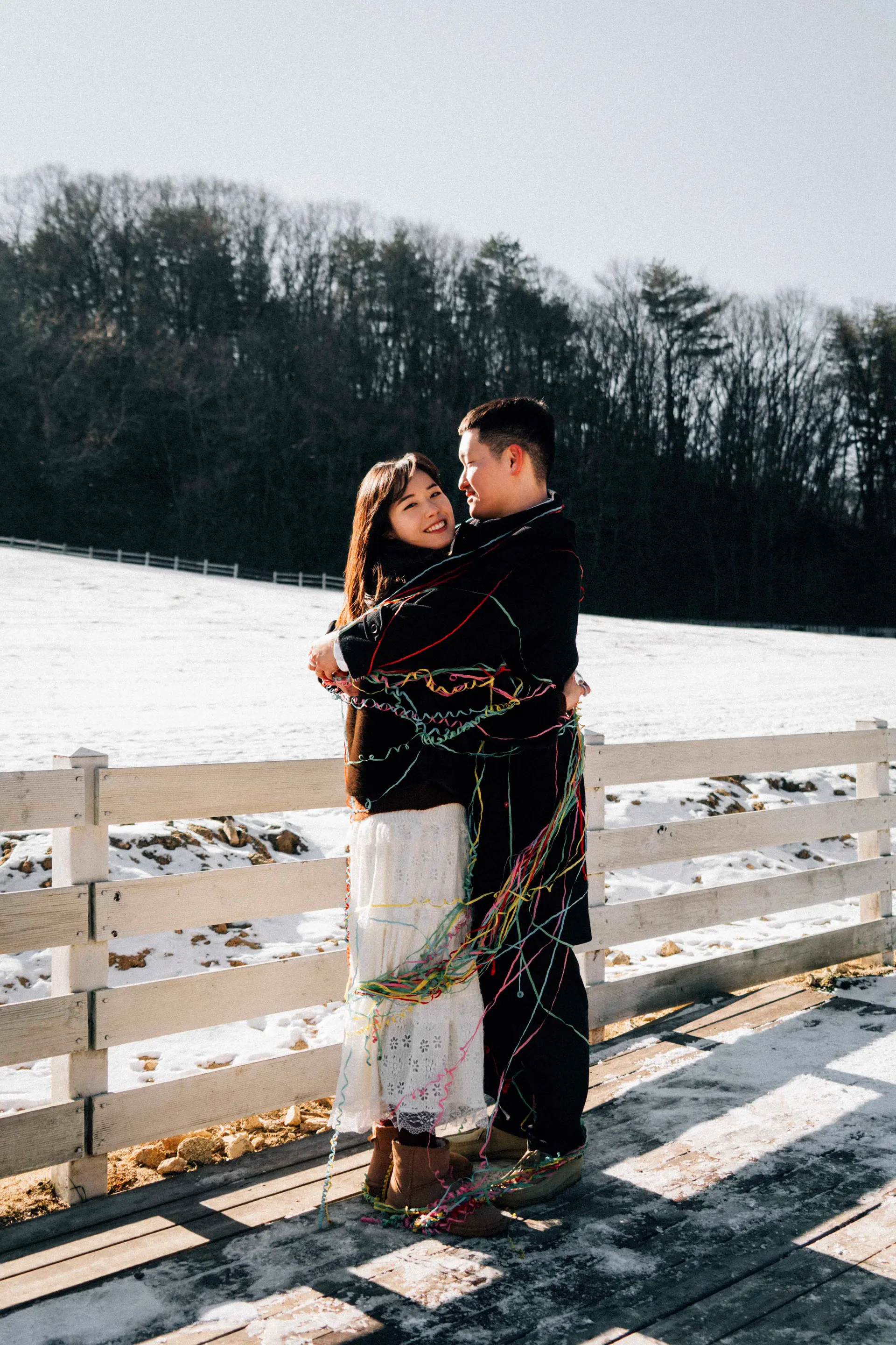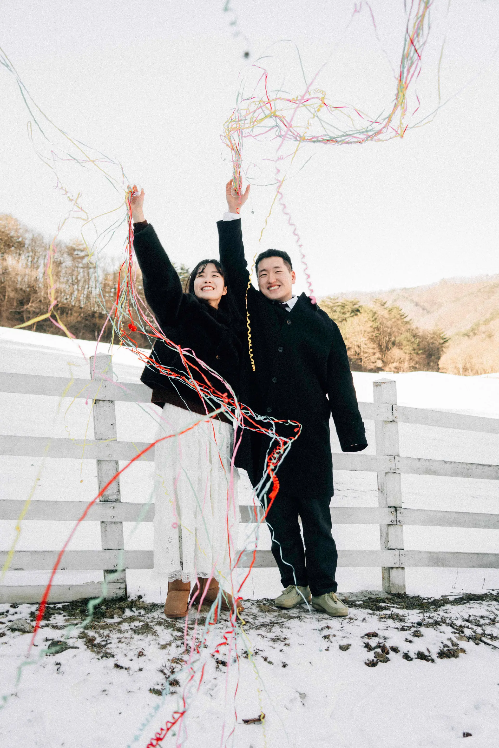 A. 걱정하지 마세요. 후안스냅은 장난스러운 대화와 소품 활용을 통해 긴장을 풀어드립니다. 추운 날씨 자체가 두 분을 더 꼭 껴안게 만드는 자연스러운 연출 장치가 되기도 하니 믿고 맡겨주세요.