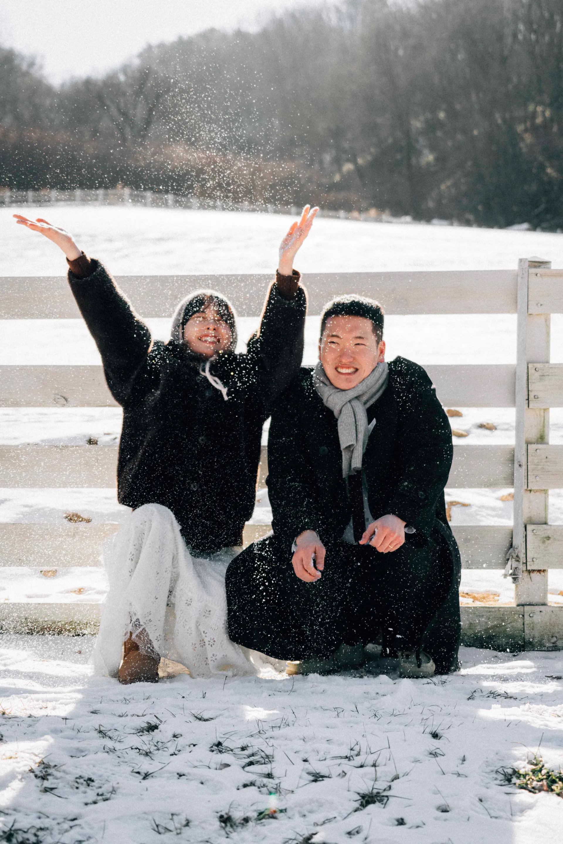 1. 웨딩 베일: 겨울의 부드러운 반사광을 머금은 베일은 신부님을 빛의 중심에 세워줍니다. 바람에 날리는 베일 컷은 눈스냅의 정수입니다.