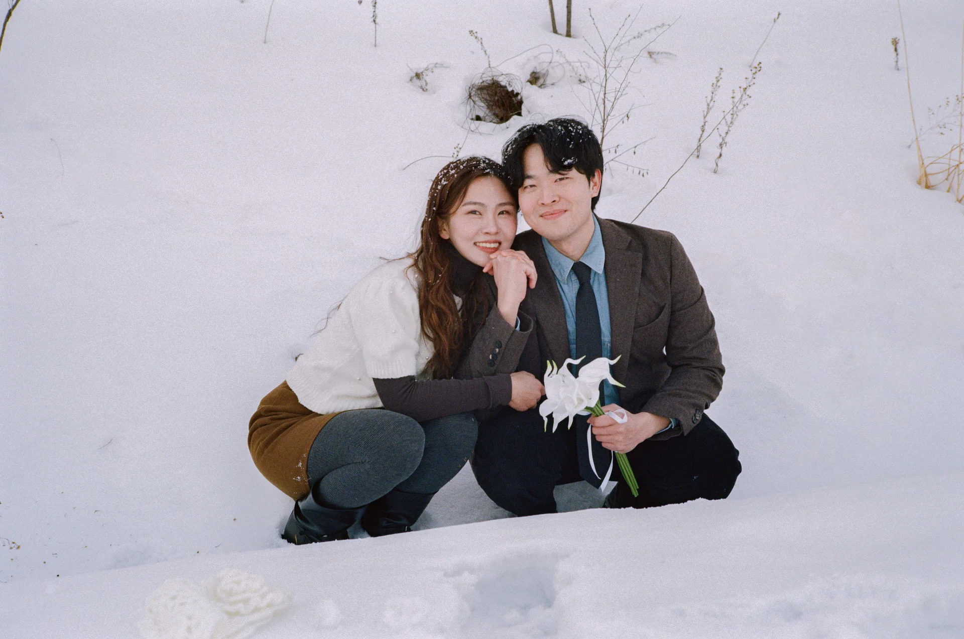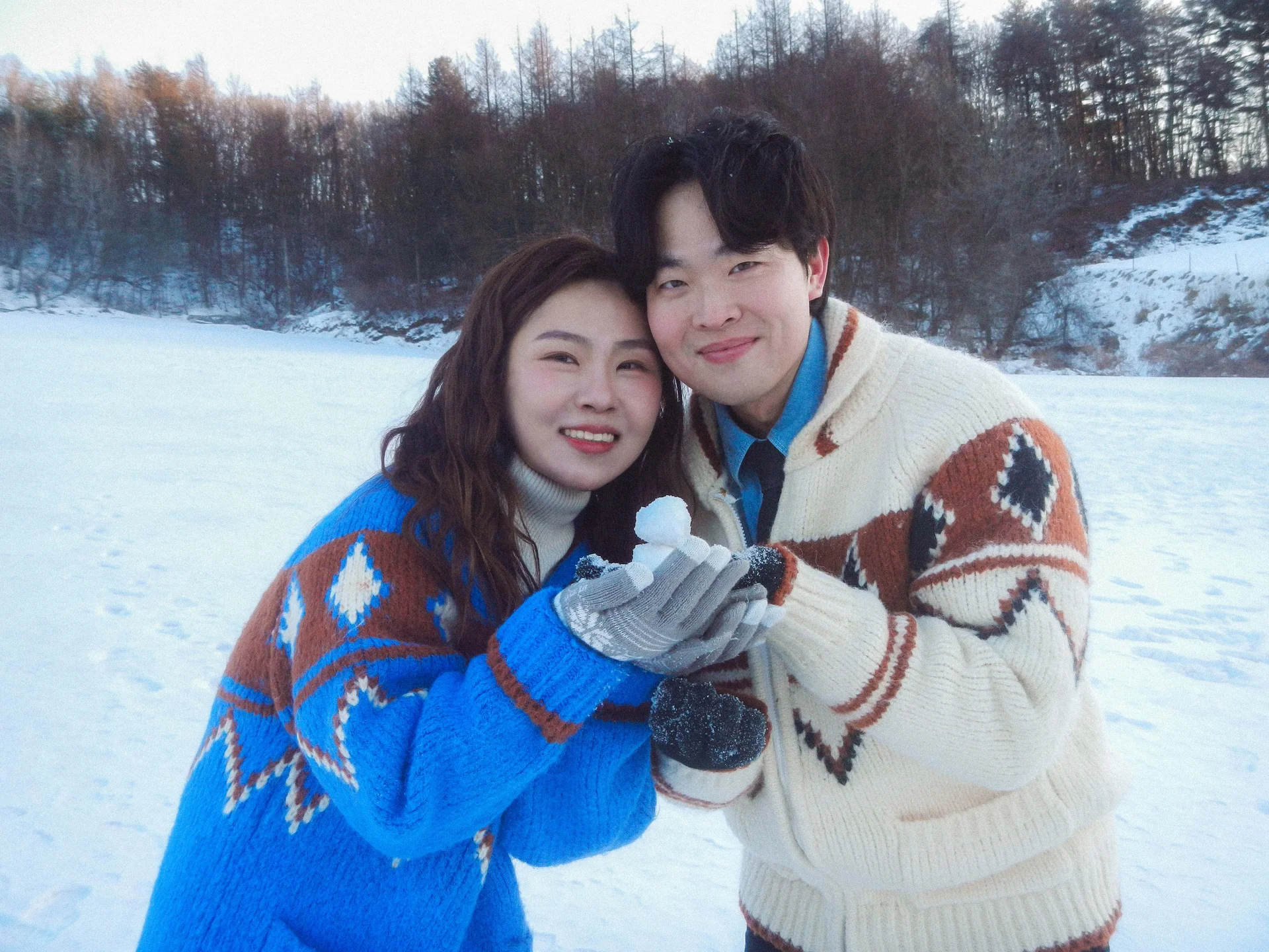 • 니트 커플룩의 조화: 이번 주인공들은 패턴이 있는 니트와 세미 포멀한 의상을 매치하셨습니다. 차가운 설원 배경 위에서 니트 특유의 포근한 질감과 컬러감이 사진에 따뜻한 생명력을 불어넣어 주었습니다.