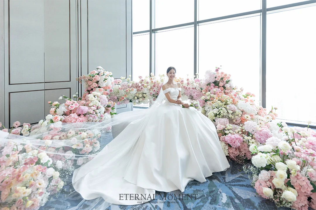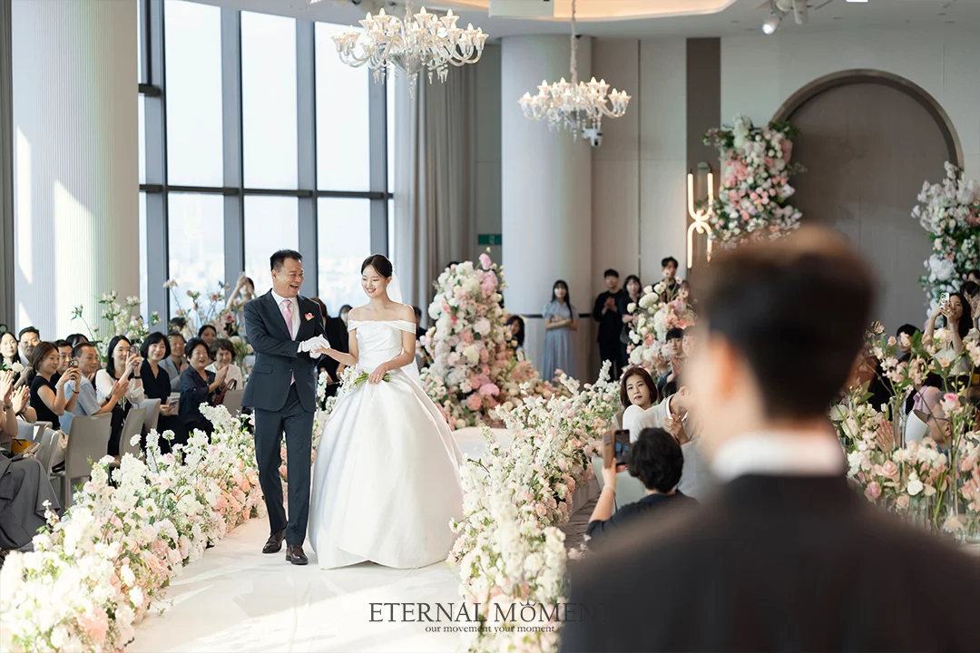 직선이 아닌 부드러운 곡선 형태의 버진로드는 입장과 퇴장 시 시시각각 인물의 각도를 변화시킵니다. 이터널모먼트는 최적의 촬영 스팟을 미리 선점하여, 신부님의 드레스 라인이 가장 우아하게 돋보이는 찰나를 놓치지 않았습니다.