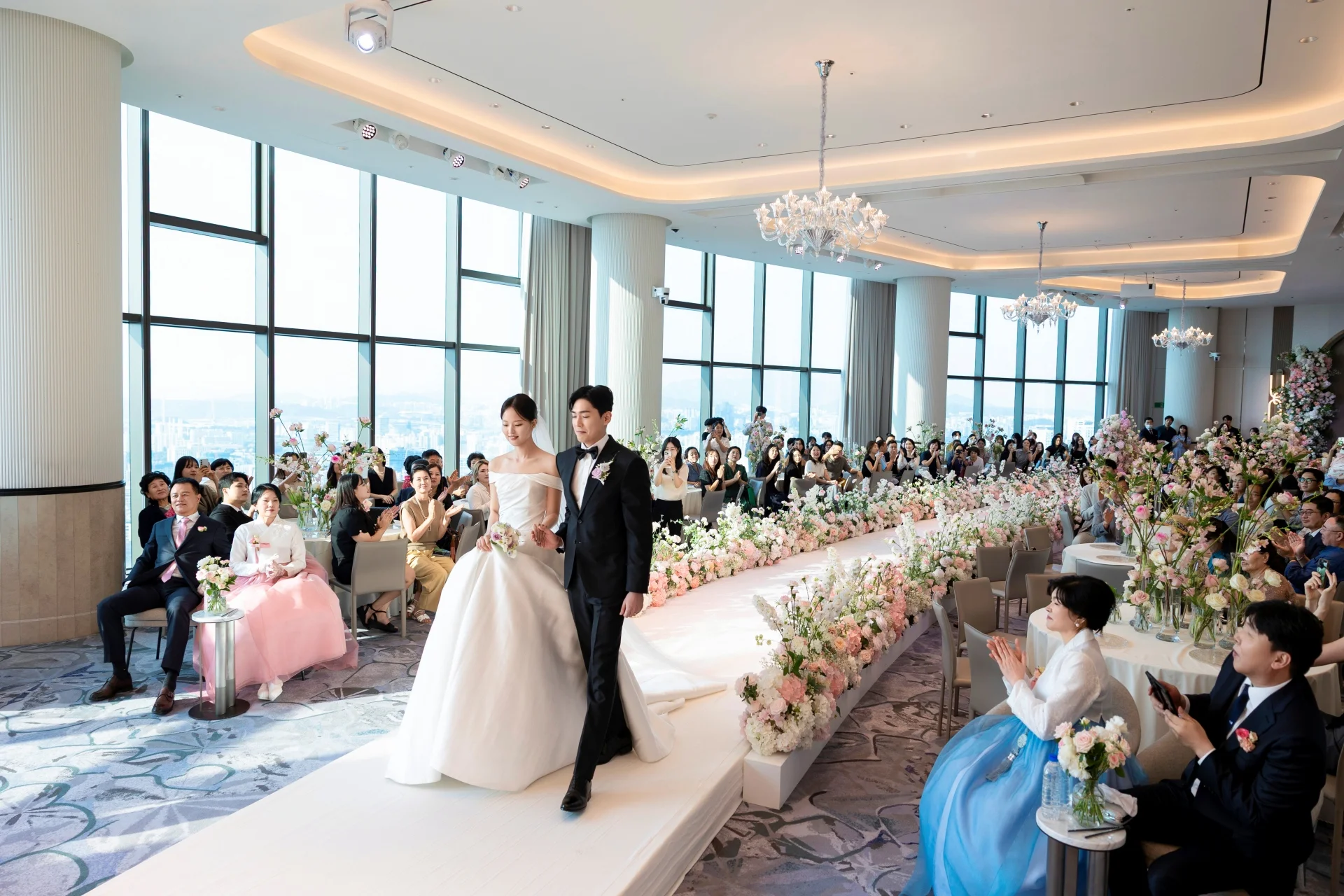 파노라마홀의 매력: 이름처럼 전면이 탁 트인 유리창으로 설계되어 서울 도심의 스카이라인을 한눈에 품고 있습니다. 높은 층고와 파스텔톤 생화 장식이 어우러져 실내임에도 마치 야외 정원에 와 있는 듯한 따뜻한 무드를 자아냅니다.