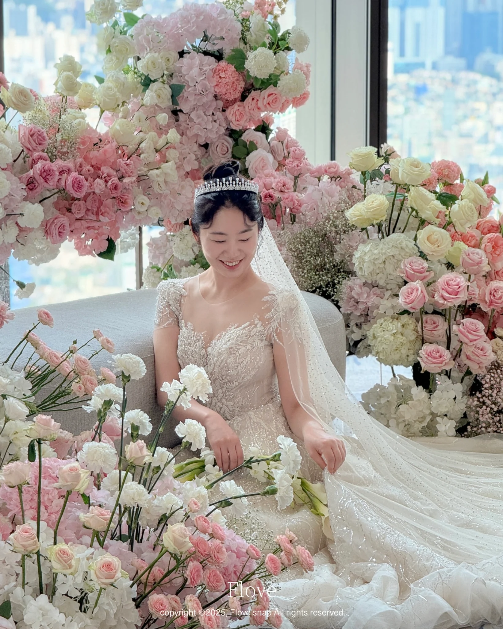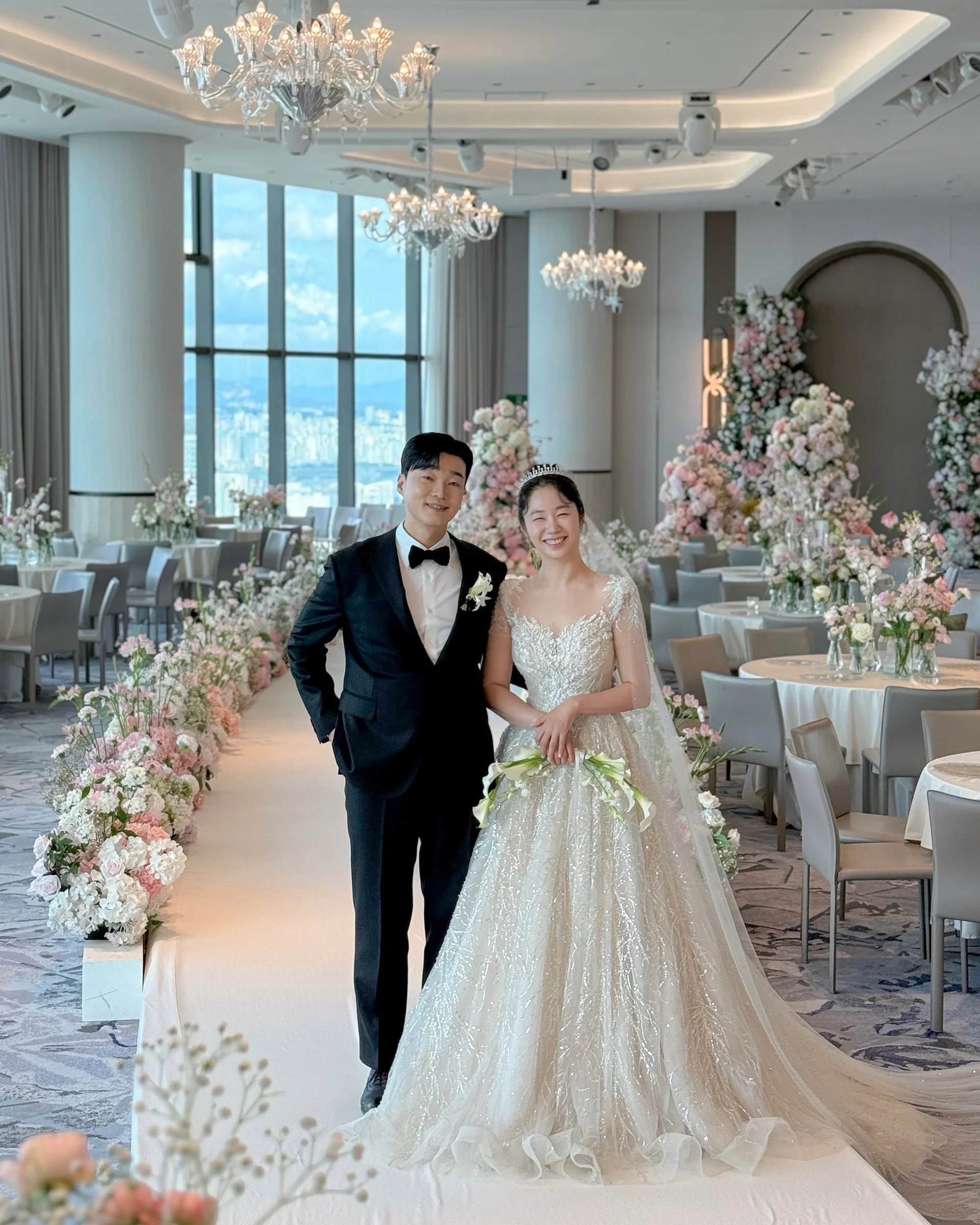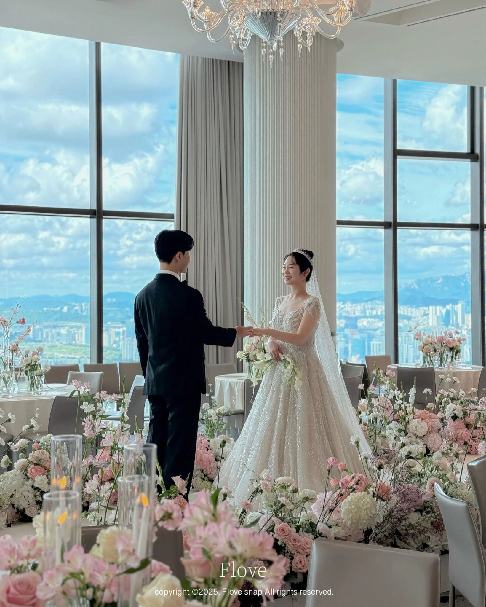 파노라마홀 (41층): 이번 촬영이 진행된 파노라마홀은 서울 시내가 한눈에 내려다보이는 통유리창이 특징입니다. 전반적으로 화이트 톤에 파스텔 생화 장식이 더해져, 낮 예식 촬영 시 별도의 조명 없이도 자연광만으로 화보급 결과물을 얻을 수 있는 ‘아이폰스냅 최적화 베뉴’입니다.