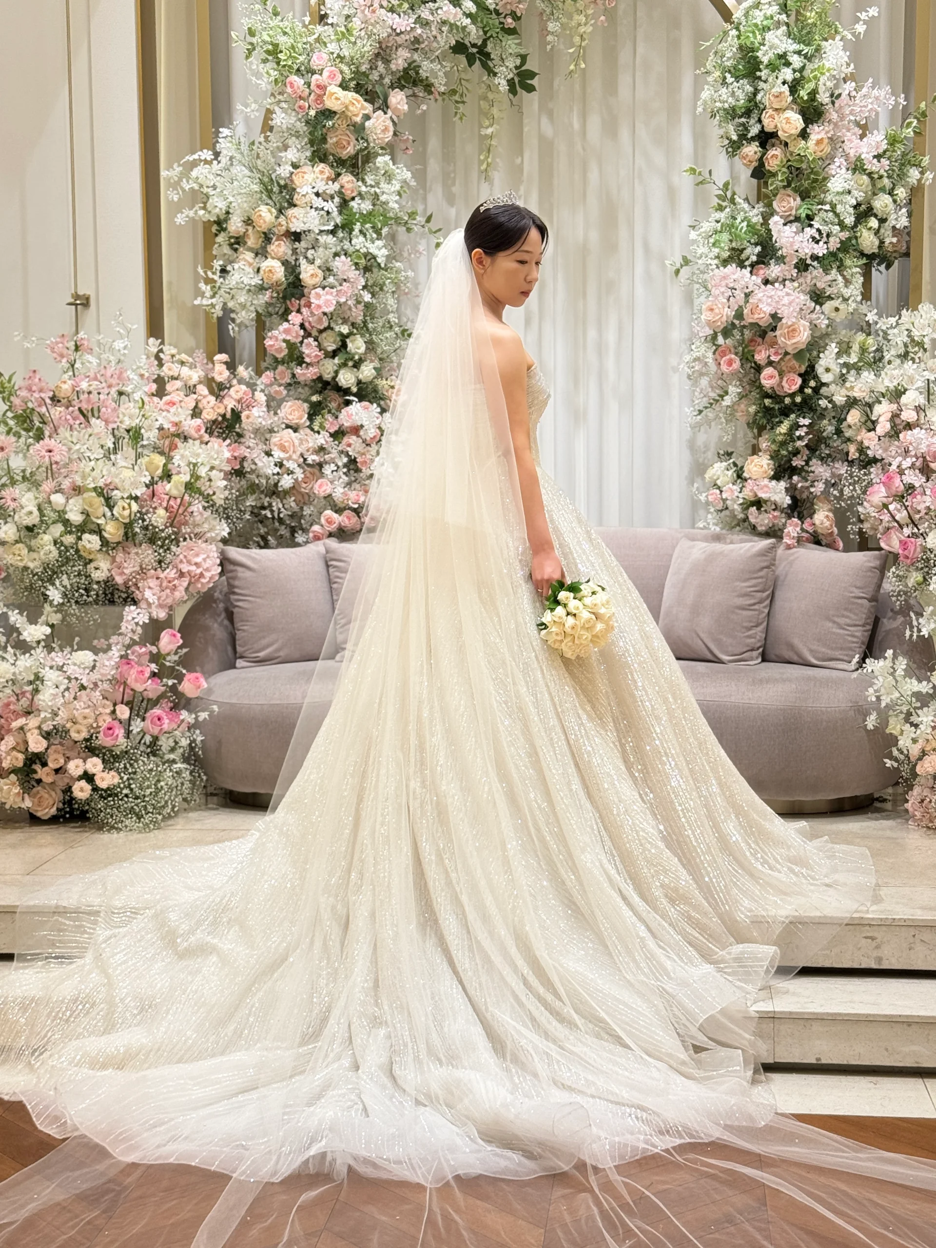 단상 위 백뷰: 샹들리에 아래에서 드레스 실루엣을 살린 백뷰 컷을 연출합니다.