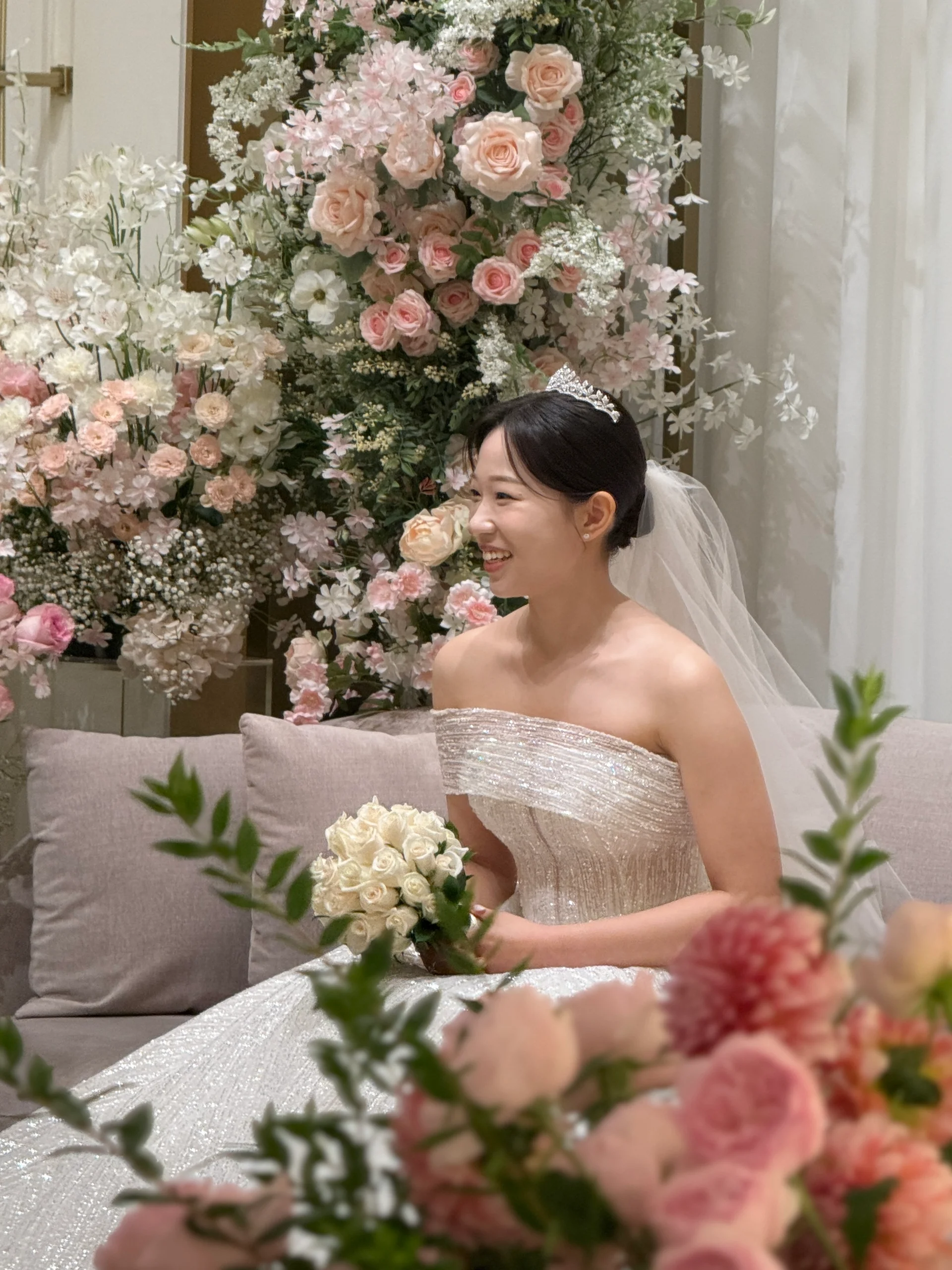 꽃기둥 연출: 화사한 플라워 데코를 프레임 삼아 커플의 감성적인 순간을 담습니다.