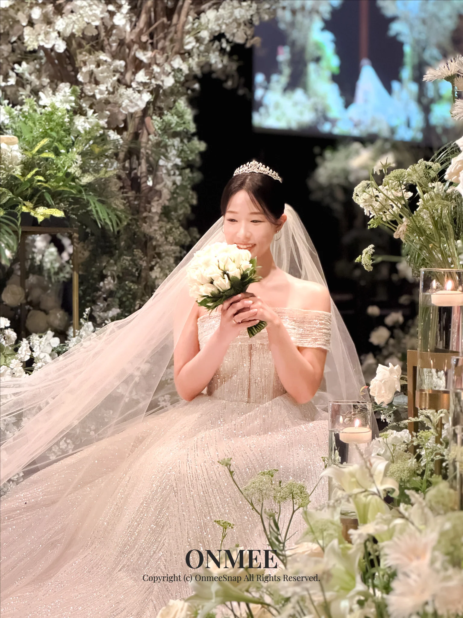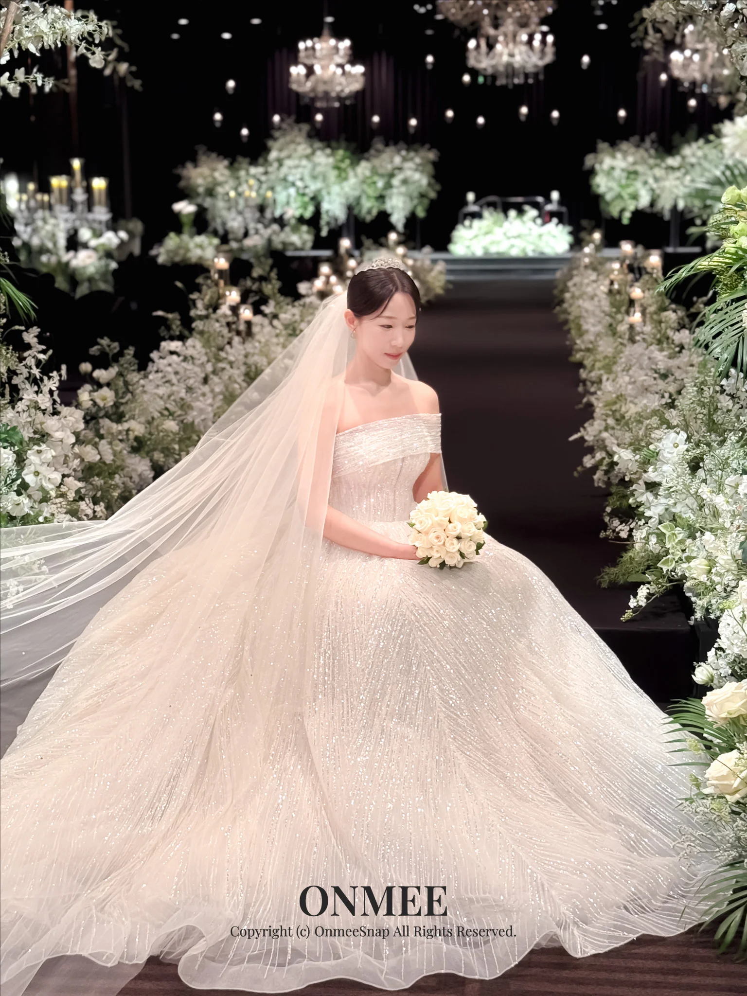 무드: 샹들리에와 화이트&그린 계열의 플라워 데코가 우아하고 웅장한 분위기를 완성합니다.