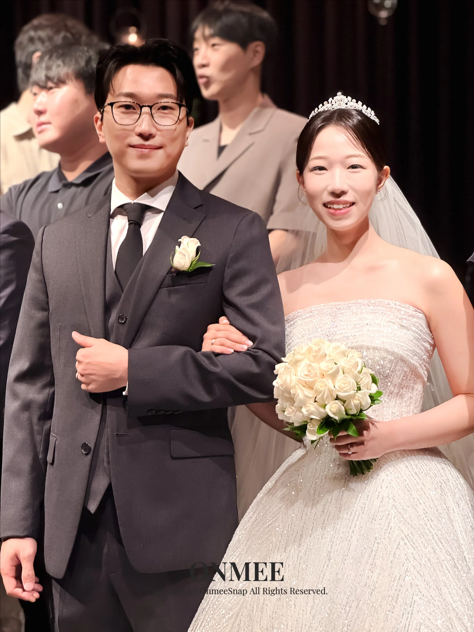 조명 설계 활용: 그랜드볼룸홀은 조도가 낮은 것이 아니라 조명 구성이 인물에 집중된 스타일입니다. 온미스냅은 아이폰의 노출과 초점을 실시간으로 조절하여, 어두운 배경 속에서도 인물이 선명하게 부각되는 결과물을 만들어냅니다.