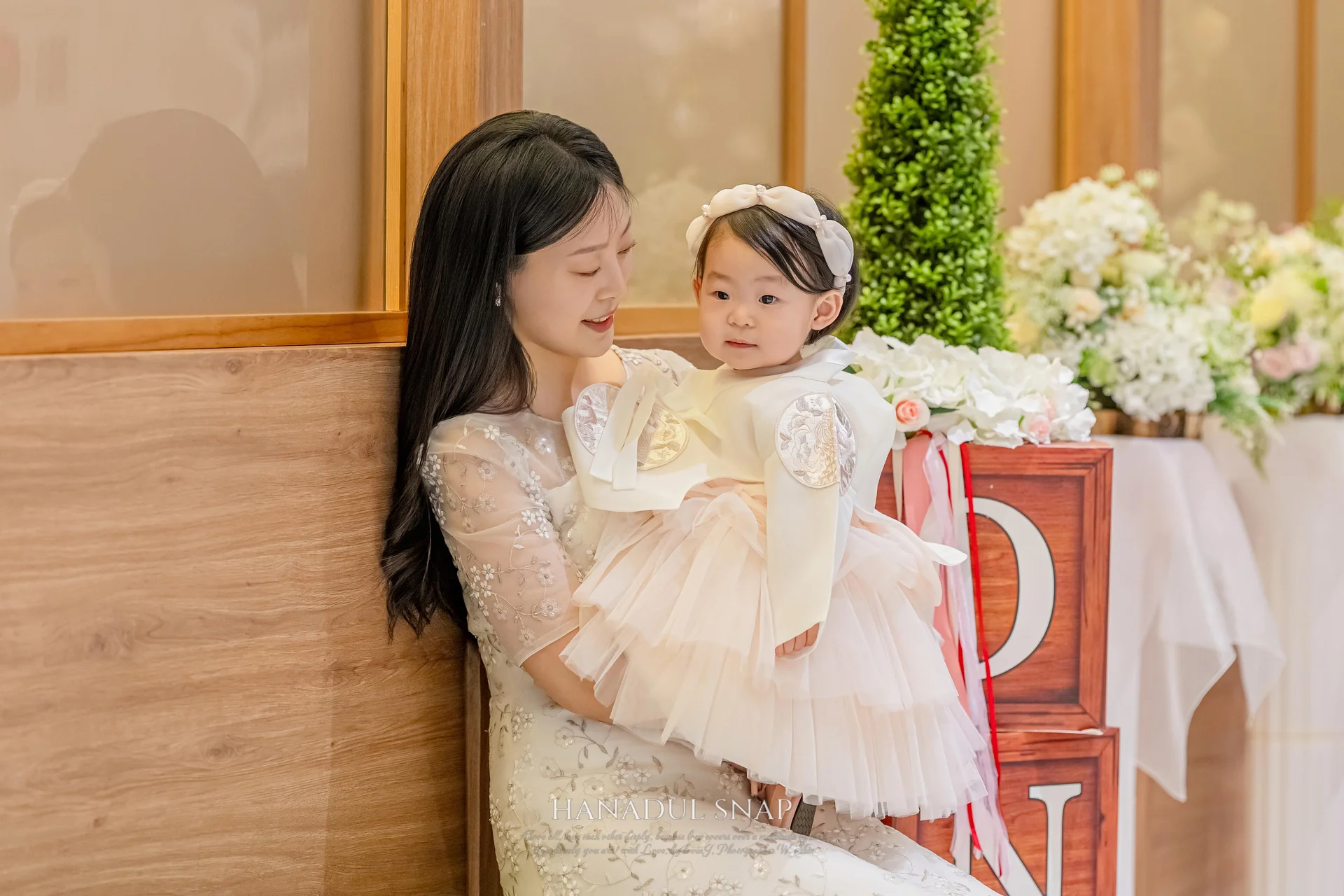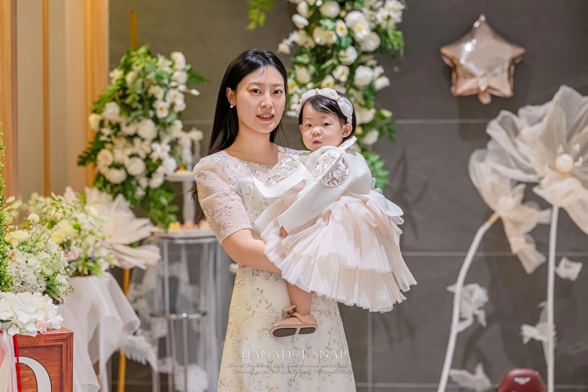 아기의 선택: 단아하면서도 화사한 한복 드레스를 착용했습니다. 한복 고유의 선과 드레스의 풍성함이 공존하여, 실내 조명 아래서 더욱 주인공답게 빛났습니다.