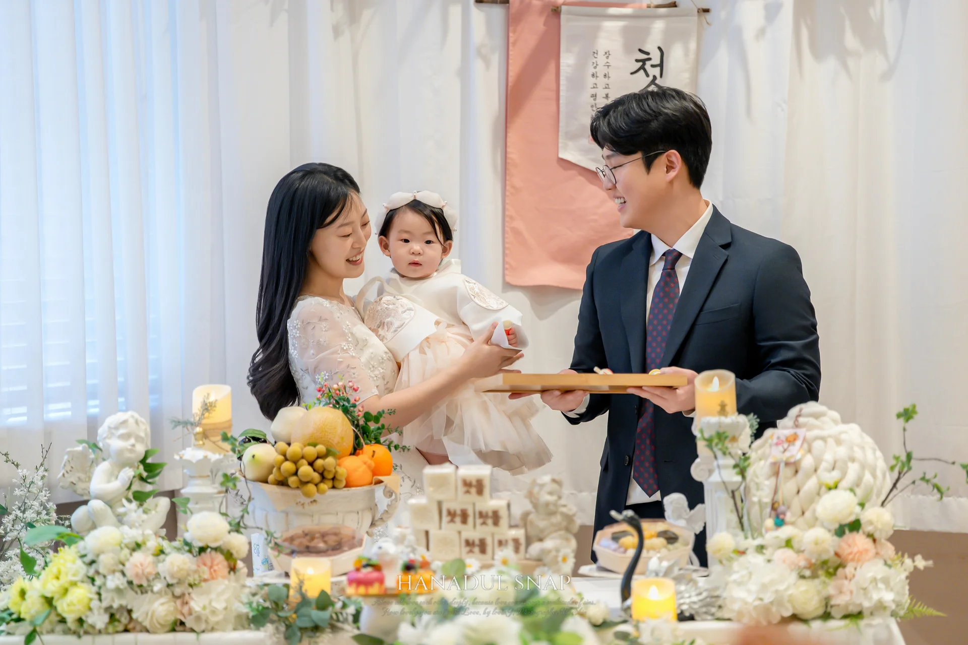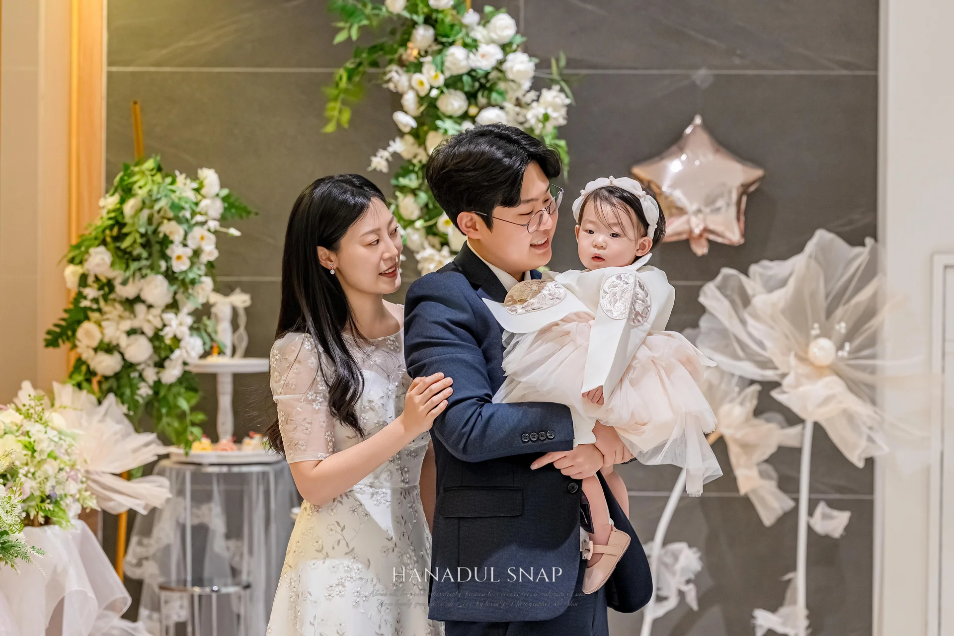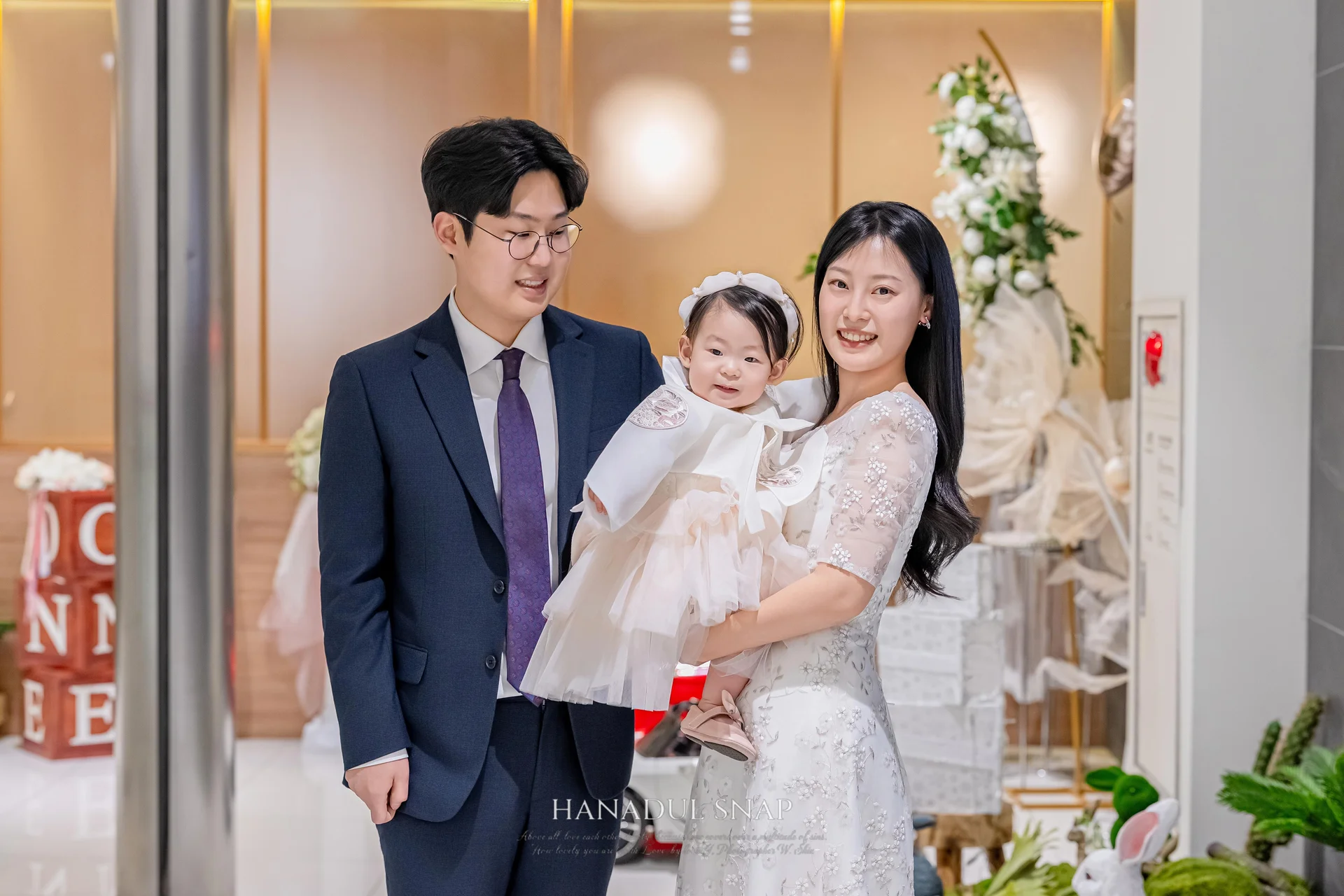 가족 시밀러룩: 엄마는 화이트 드레스로 화사함을, 아빠는 모던한 정장으로 신뢰감을 더했습니다. 전체적으로 깔끔하고 정돈된 스타일링은 시간이 흘러 보아도 촌스럽지 않은 클래식한 기록을 완성했습니다.