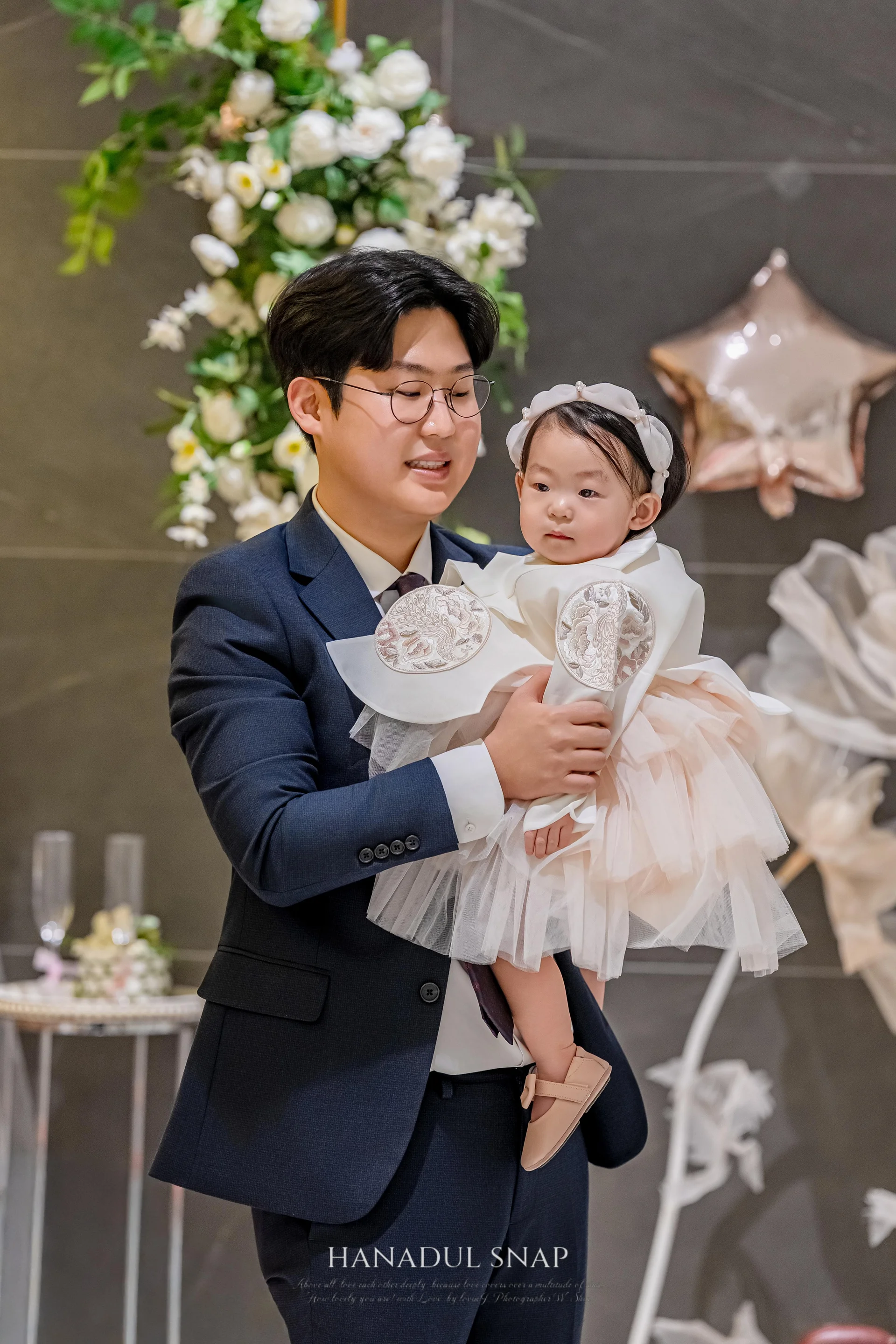 겨울 시즌 촬영이었기에 거궁 입구의 전용 포토존을 적극 활용했습니다. 공간이 아주 넓지는 않지만, 러빈제이스냅만의 각도 설계로 아기 단독 컷부터 가족 교감 컷까지 밀도 있게 담아냈습니다. 소규모 예식은 하객과의 거리가 가까워 웃음소리와 대화가 끊이지 않는 현장감이 사진 속에 고스란히 묻어납니다.