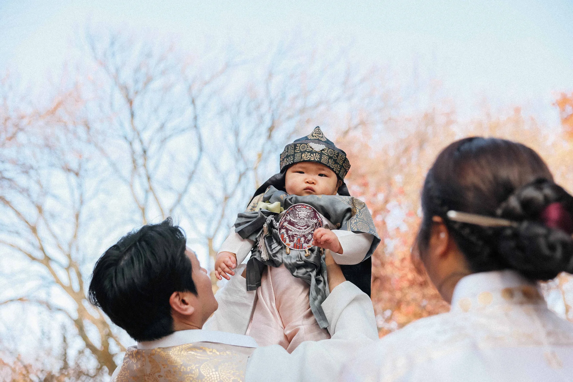 톤온톤의 우아함: 엄마와 아기는 차분한 다운톤의 고운 한복을, 아빠는 따뜻한 베이지톤 한복을 매치하여 전체적인 사진의 채도가 부드럽고 진득하게 완성되었습니다.
