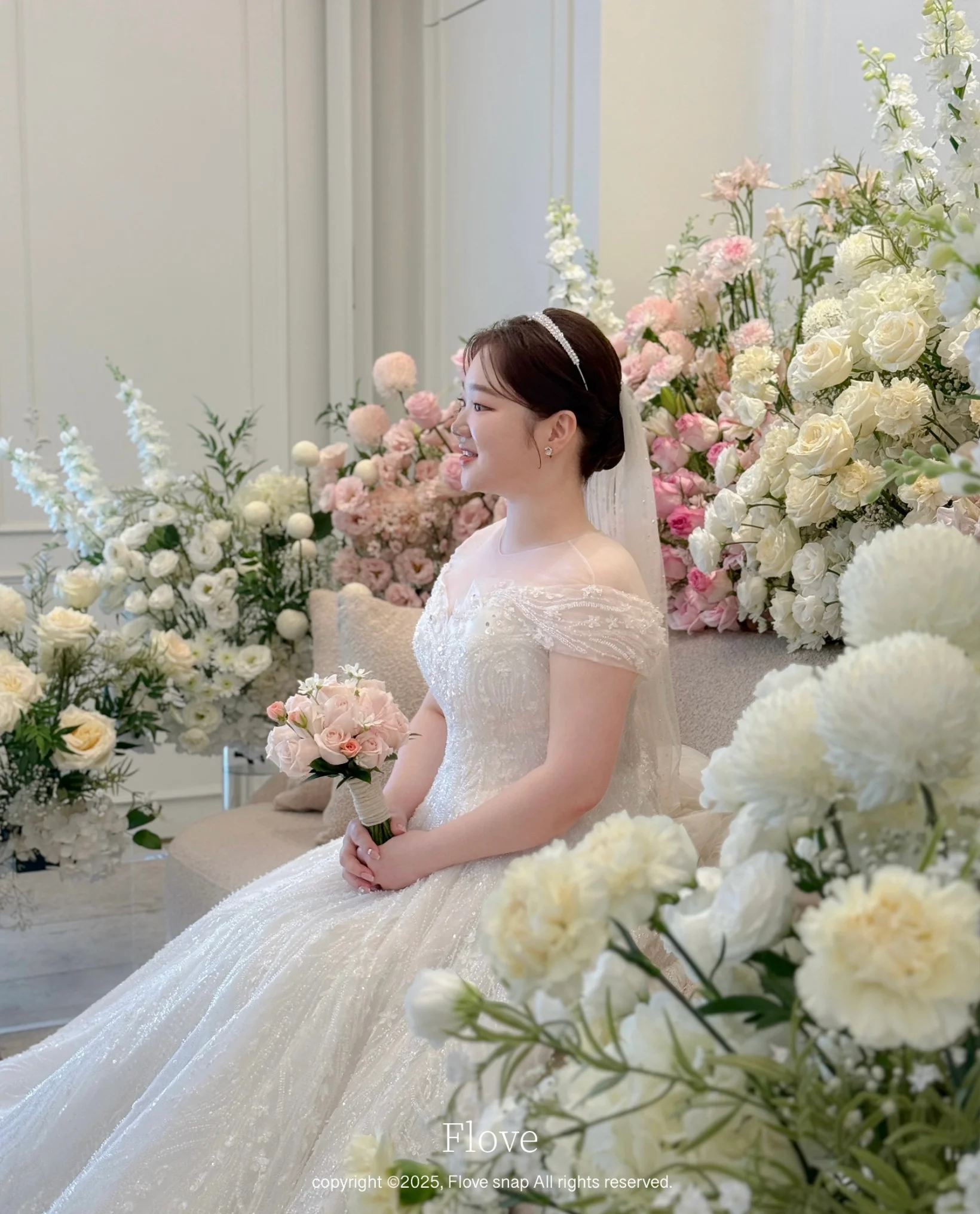 화이트 아치 구조와 웜톤 베이지 벽면, 크림 컬러의 소파가 조화를 이루는 공간입니다. 부드러운 빛이 감도는 이곳은 신부님의 피부 톤을 화사하게 잡아주며, 유려한 곡선미 덕분에 단독 연출 컷에서 최상의 우아함을 자아냅니다.