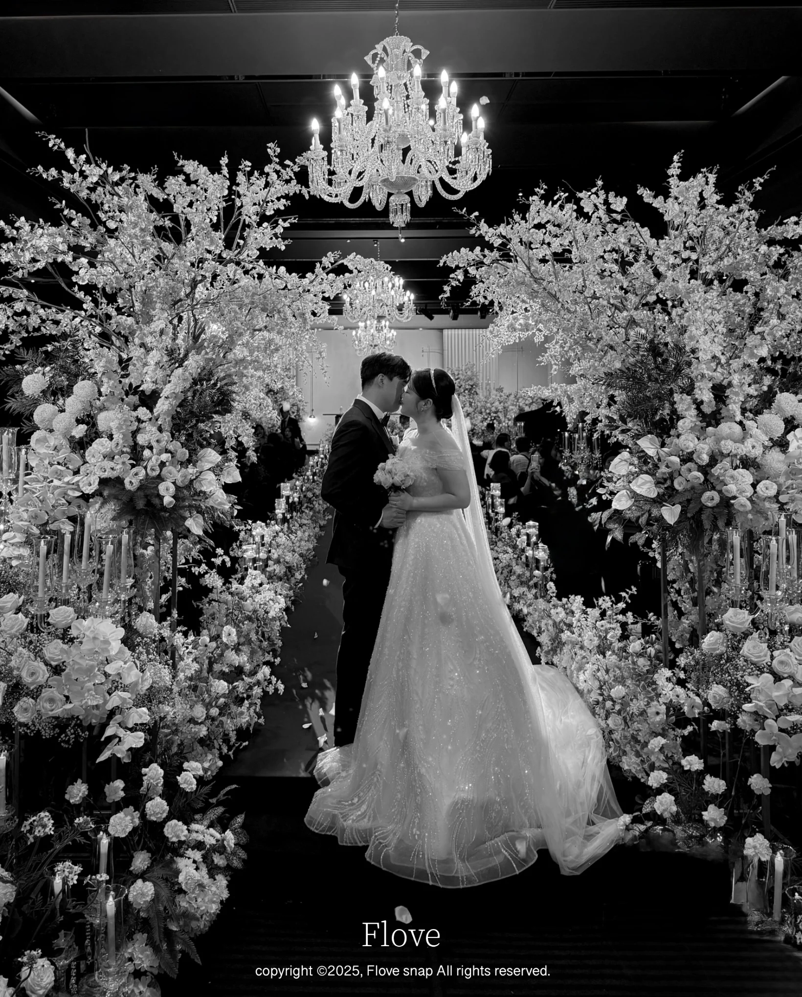 화려한 샹들리에와 대형 생화 장식이 어우러진 플라워 터널형 버진로드가 압권입니다. 어두운 배경에 인물에게만 집중되는 핀 조명은 아이폰 특유의 선명한 질감을 극대화해 주어, 마치 영화 포스터 같은 드라마틱한 컷들을 완성해 줍니다.