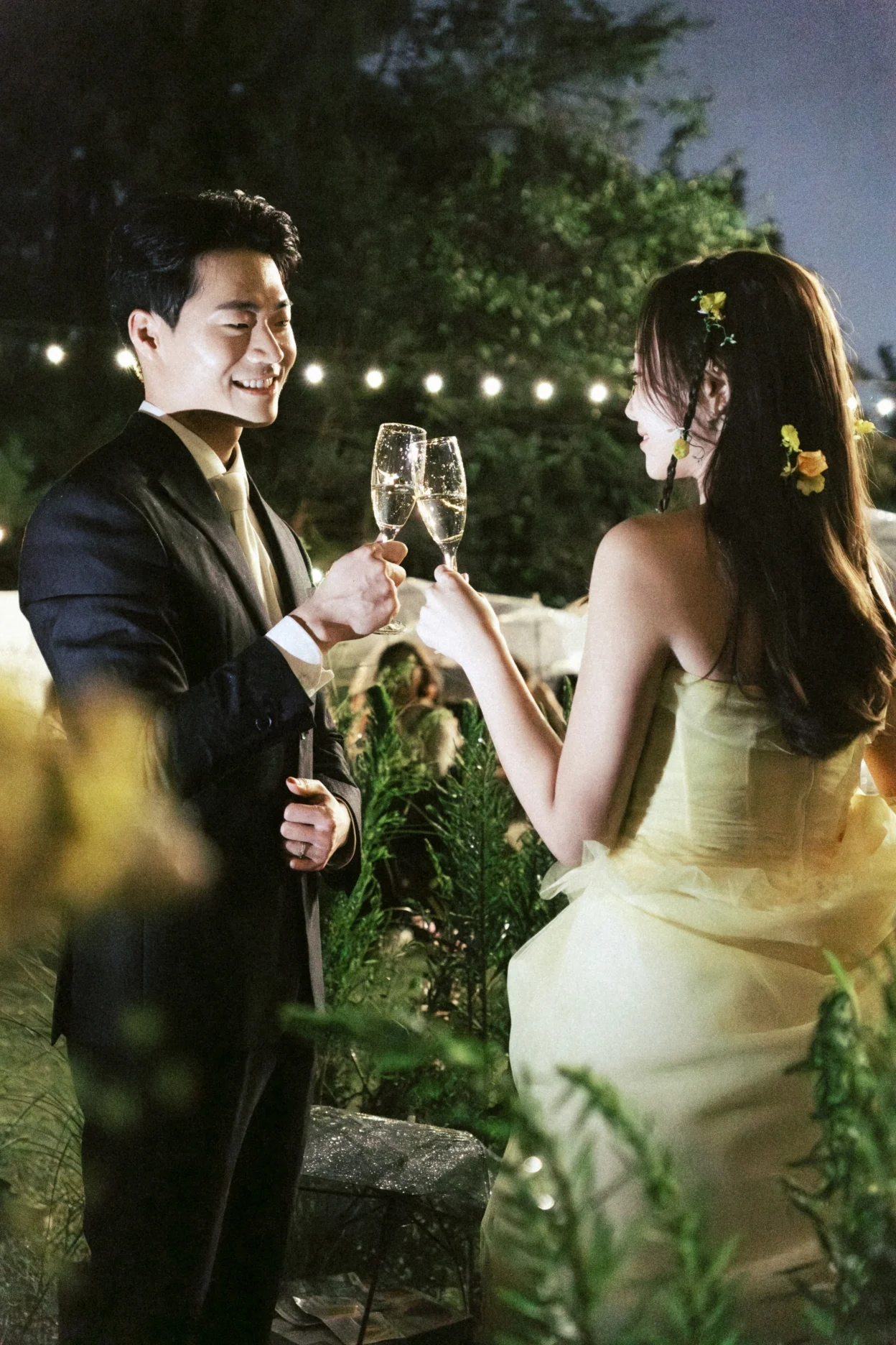 완전히 해가 진 뒤 시작된 2부에서는 예기치 못한 비가 내리기 시작했습니다. 하지만 이는 오히려 신의 한 수가 되었습니다. 젖은 잔디에 반사되는 화려한 조명, 투명 우산을 쓰고 이동하는 두 분의 모습은 영화 <어바웃 타임>의 한 장면처럼 몽환적인 무드를 자아냈습니다.