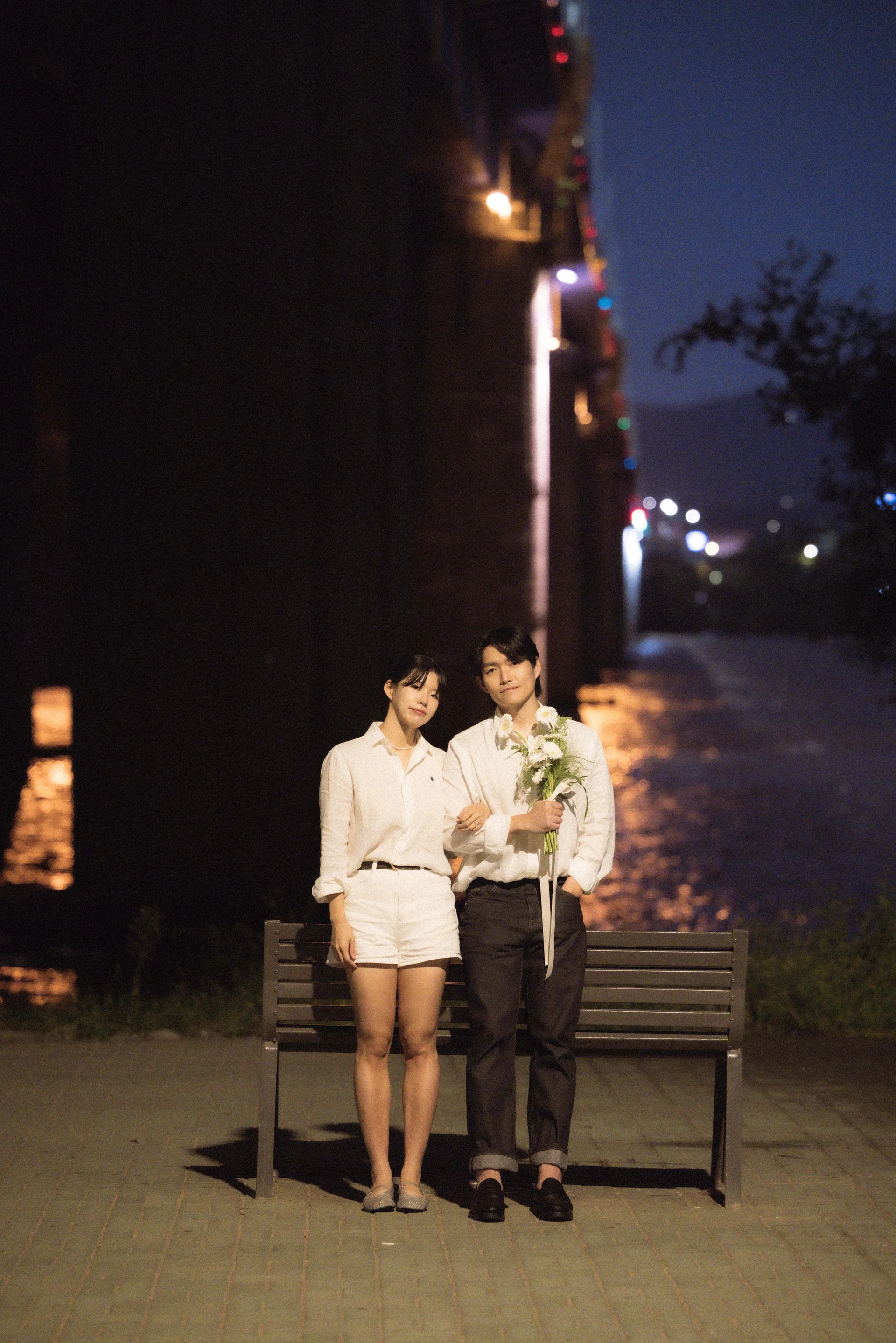 커플 스니커즈와 캐주얼룩, 야경 배경과 조화로운 화이트 원피스 / 블랙톤 정장