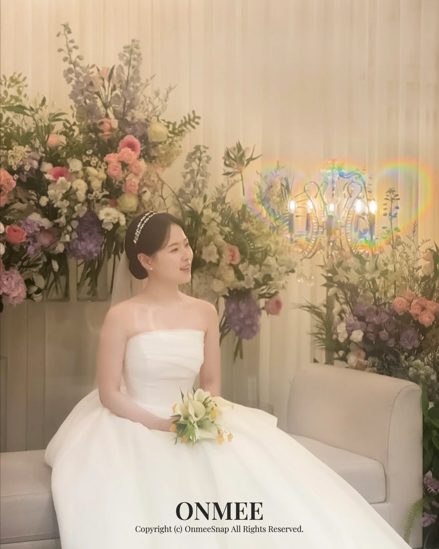 길게 뻗은 버진로드 양옆을 가득 채운 그리너리 플라워 장식은 마치 숲속을 걷는 듯한 신비로움을 줍니다. 온미스냅이 명명한 **“그레이스홀 시그니처 샷”**인 버진로드 끝단 촬영은, 쏟아지는 빛이 드레스의 질감을 살려주며 몽환적인 화보를 완성합니다.