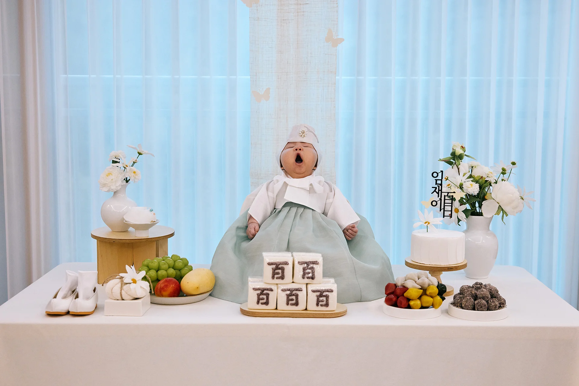 • 왜곡 방지 팁: 백일상과 카메라 사이의 거리가 너무 가까우면 광각 렌즈 특유의 왜곡이 생길 수 있습니다. 충분한 후퇴 거리가 확보되는 거실 공간은 안정적인 구도의 사진을 남기기에 가장 적합합니다.