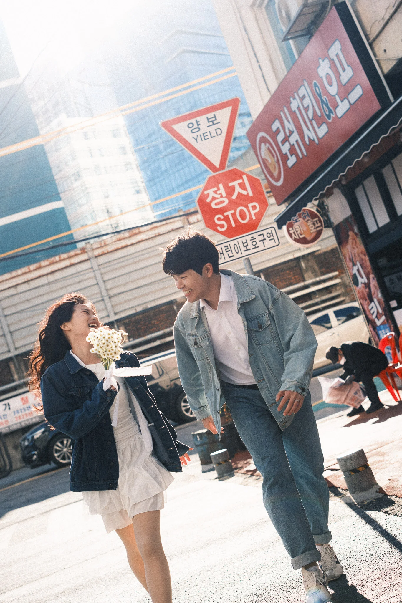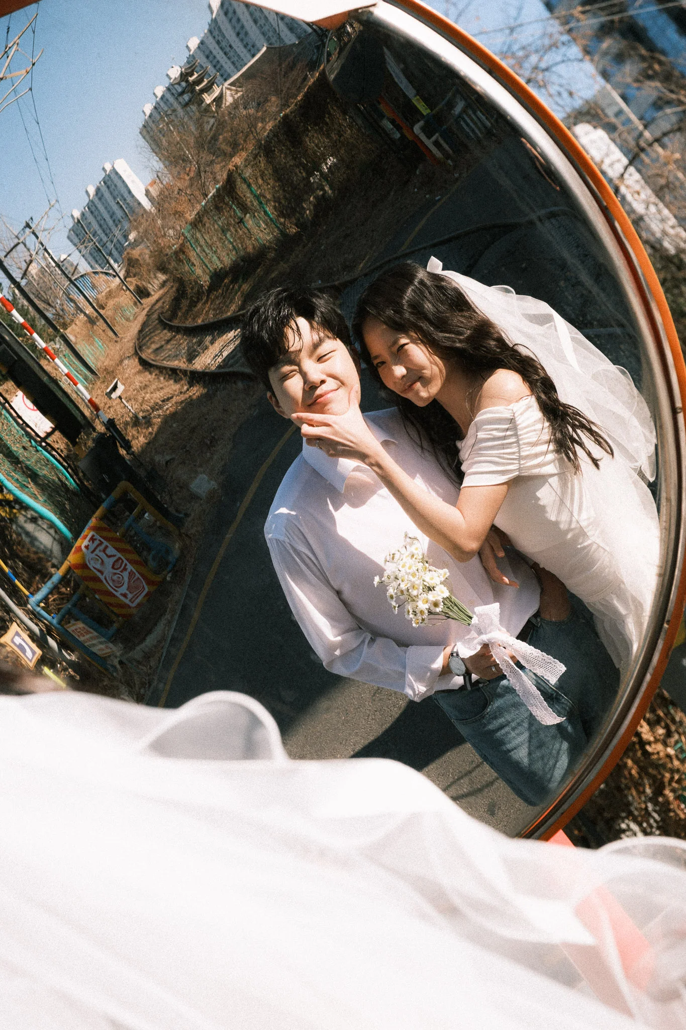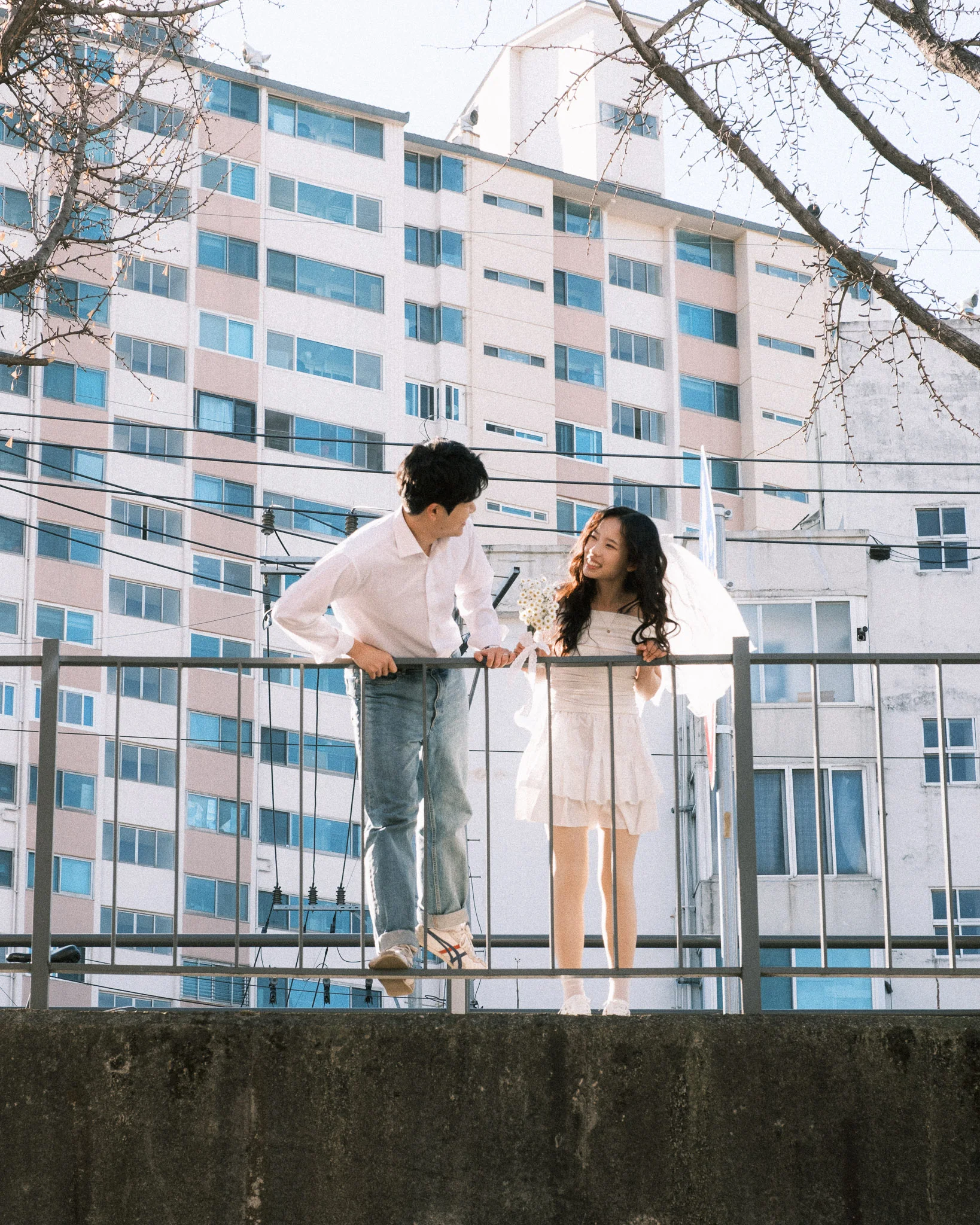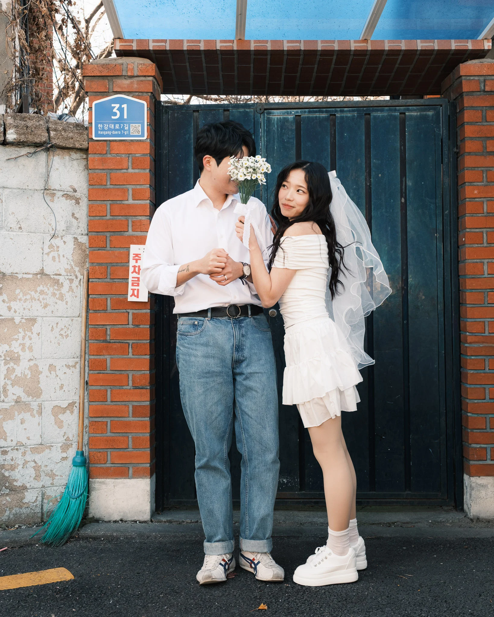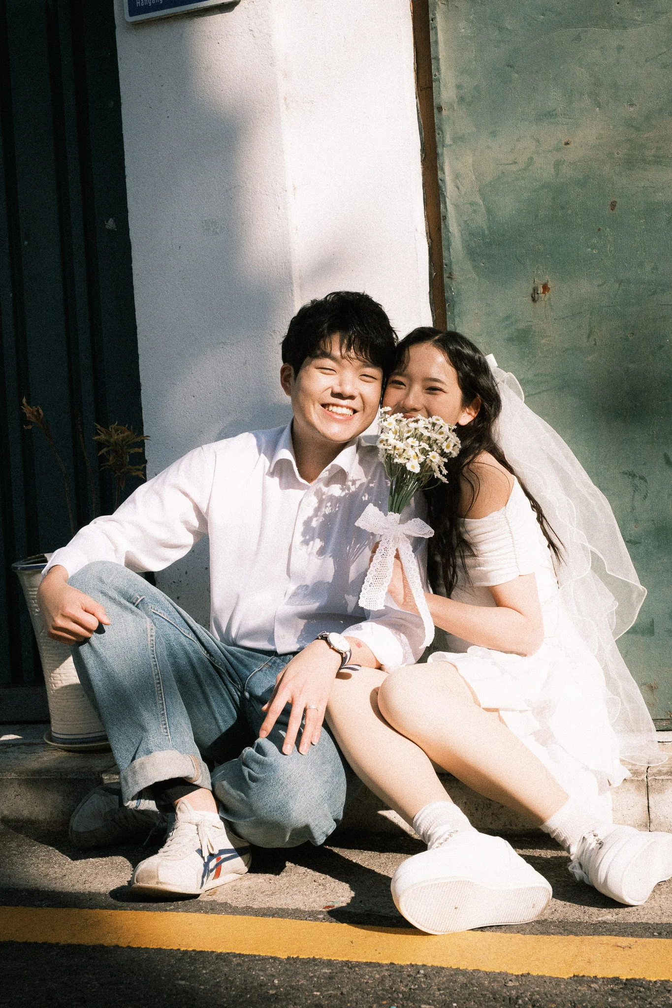 • 스타일링 제안: 이번 커플은 영화 속 풋풋한 첫사랑 느낌을 위해 톤다운된 아이보리와 베이지 의상을 선택하셨고, 이는 백빈건널목 특유의 색감과 어우러져 마치 오래된 필름 사진 같은 결과물을 만들어냈습니다.