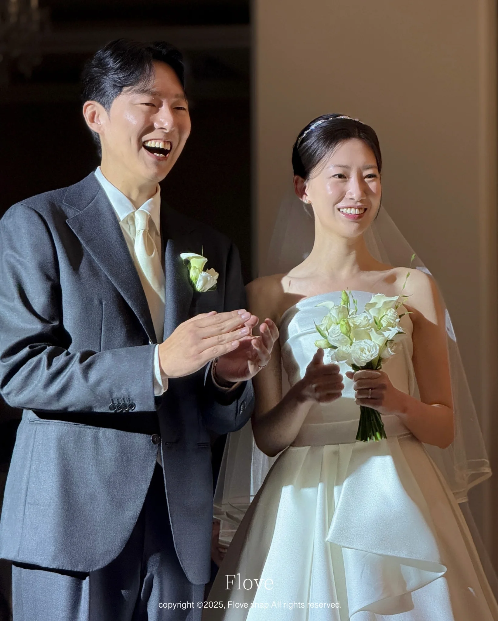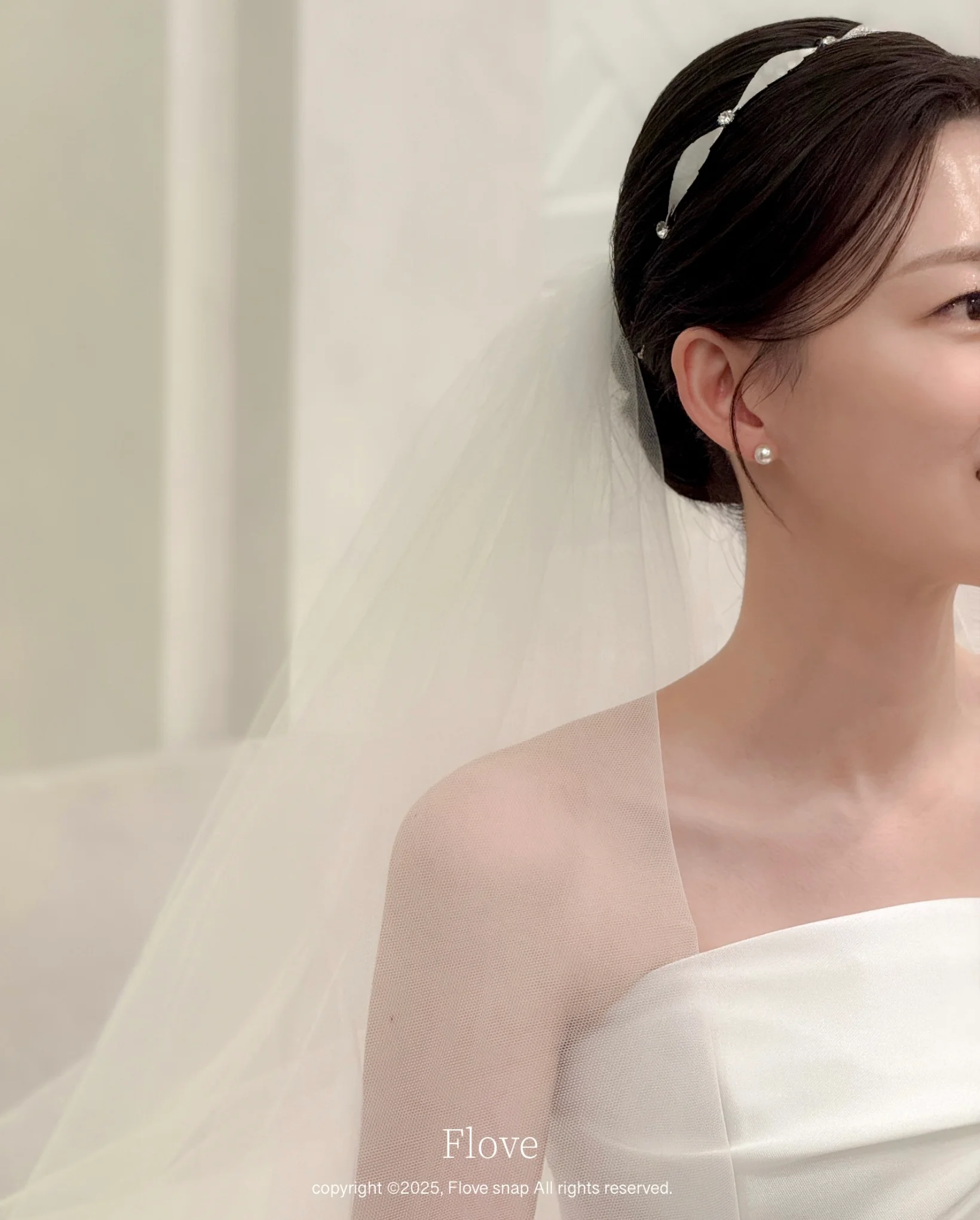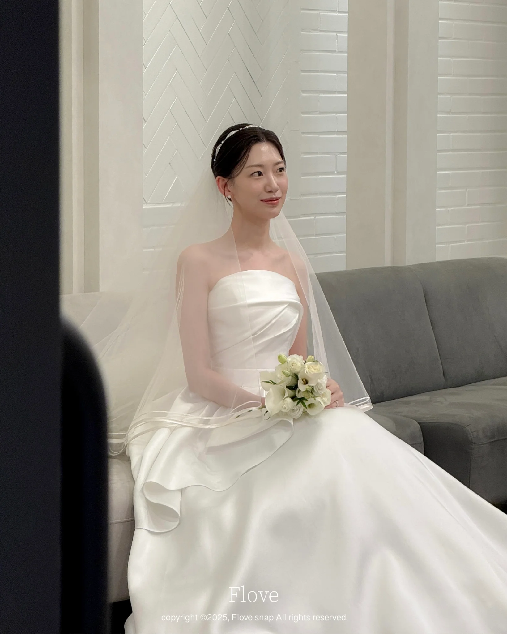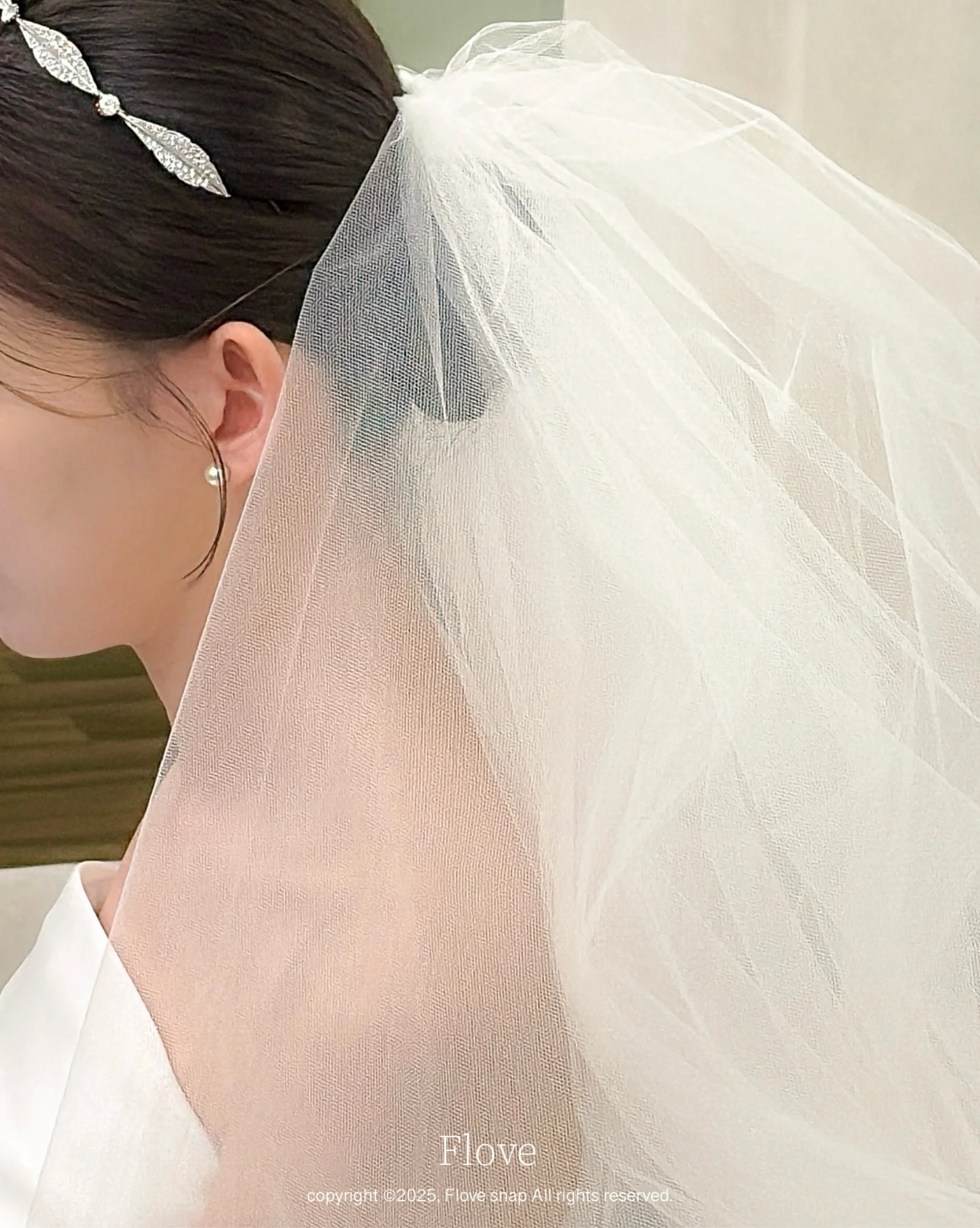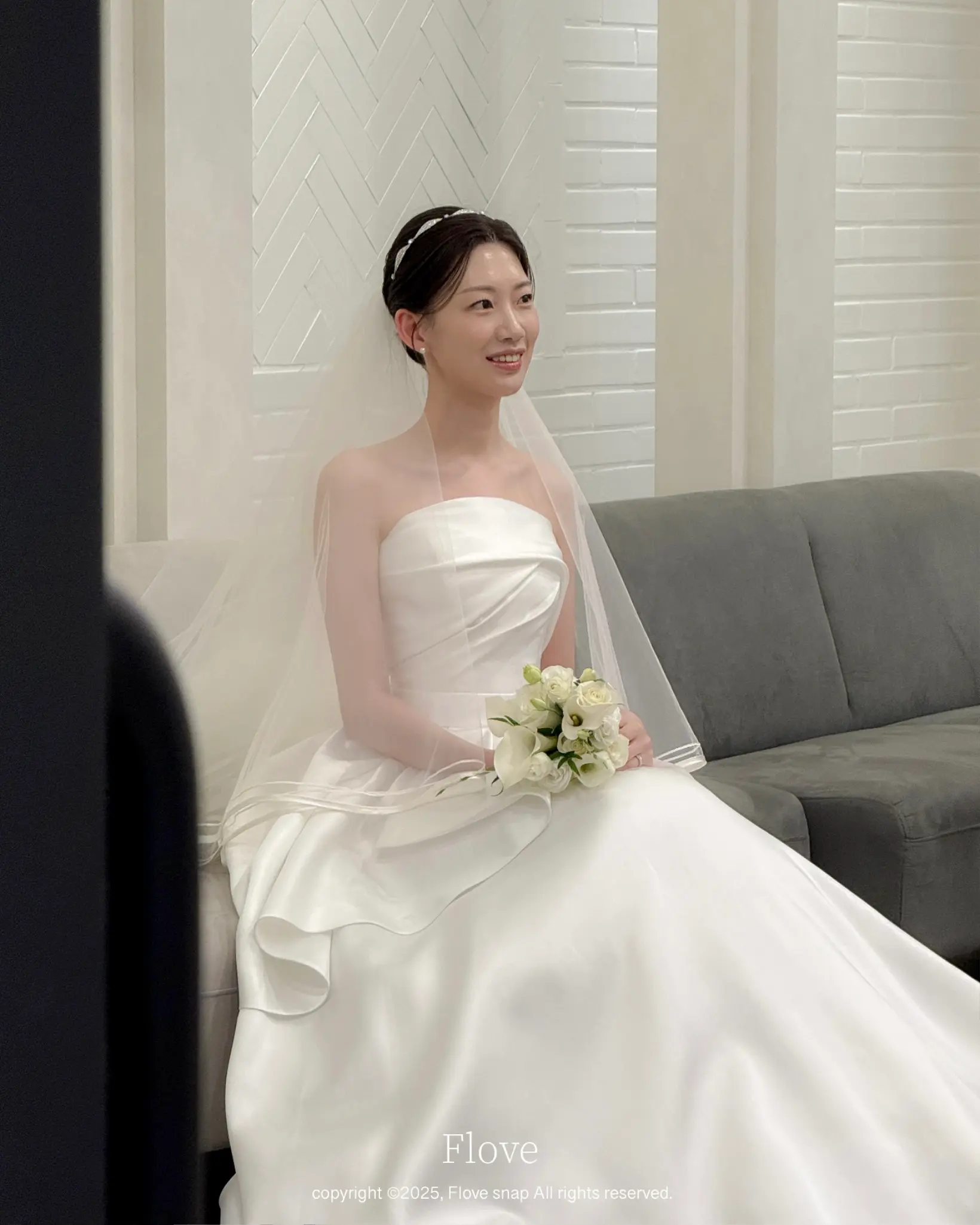 A. 더화이트베일 신부대기실은 자연광과 고급 조명이 잘 어우러진 공간입니다. 플로브스냅은 아이폰의 정확한 노출 조절과 인물 모드를 활용하여, 과도한 빛 번짐 없이 신부님의 피부톤을 화사하고 부드럽게 표현하는 데 집중합니다.