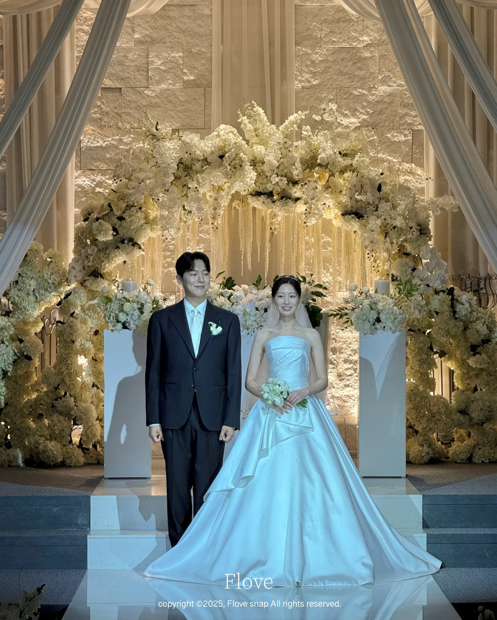 화이트톤 아트월과 플라워 장식, 그리고 부드러운 곡선 벤치와 샹들리에가 배치되어 고급스러움을 더합니다. 밝은 조도 덕분에 신부 단독샷, 가족과의 연출컷도 깔끔하게 연출 가능합니다.