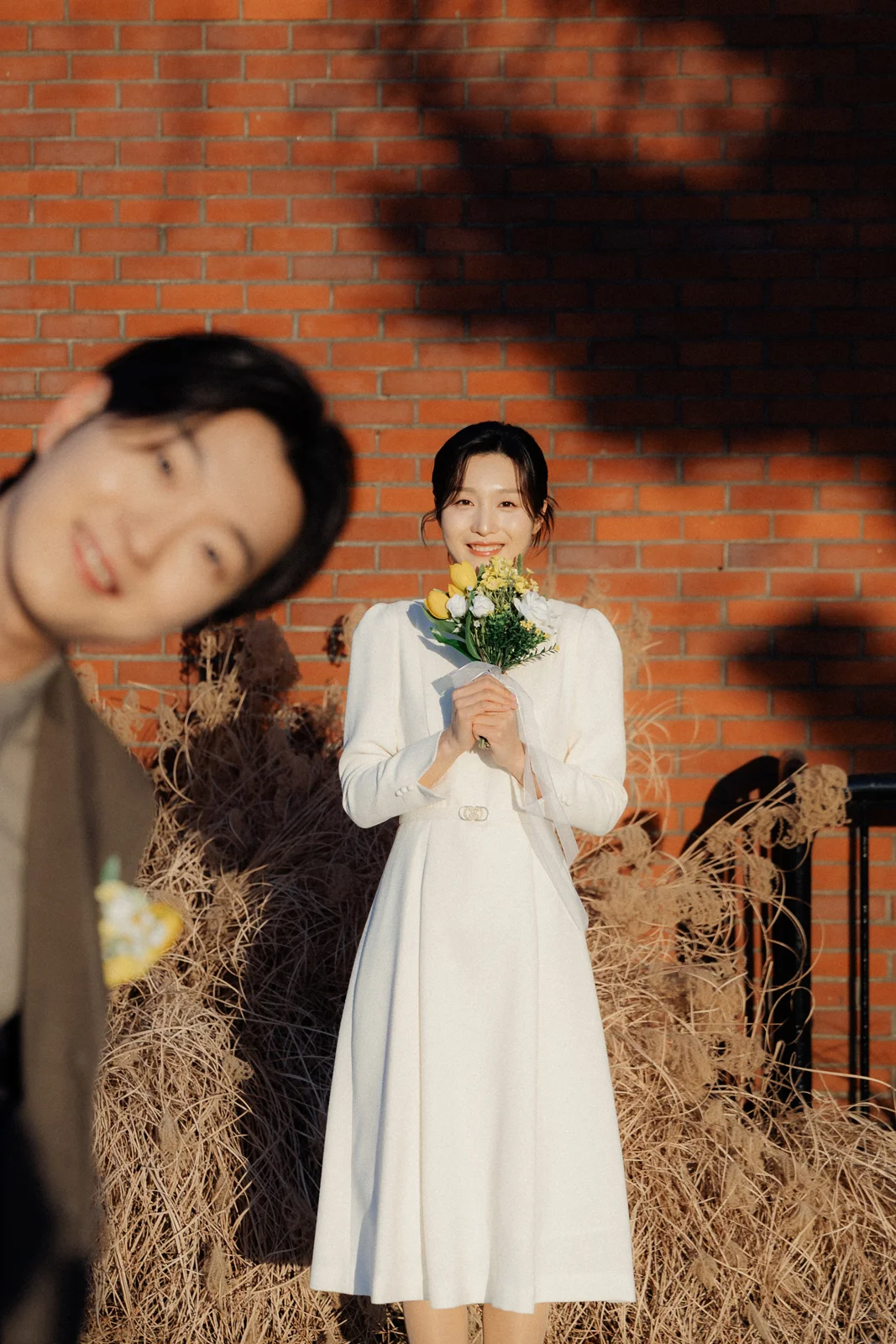 스타일링 팁: 화이트, 아이보리, 베이지 계열의 의상을 선택해 보세요. 붉은 벽돌 배경과 조화를 이루면서도 인물이 더욱 투명하고 맑게 돋보이는 효과를 줍니다.